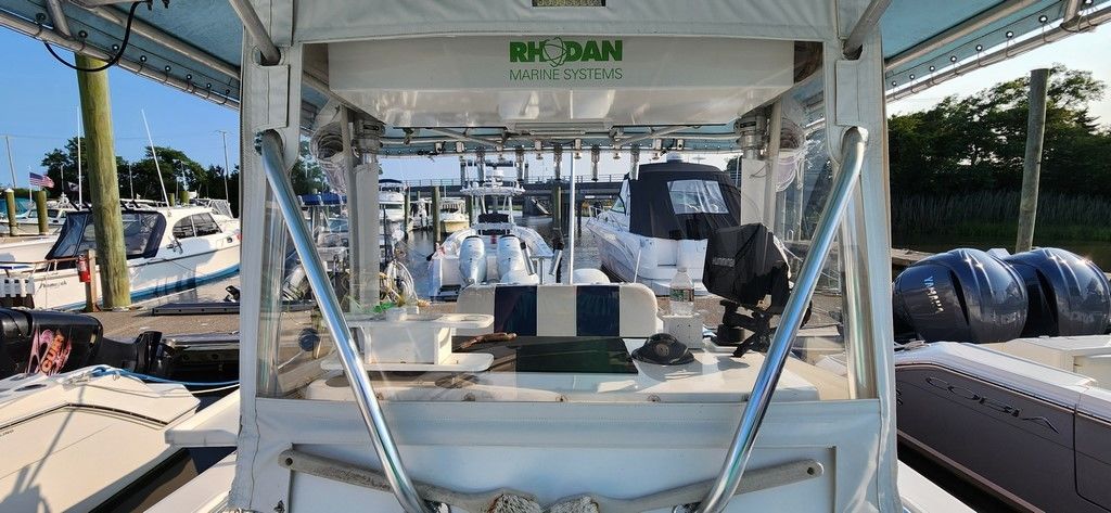 Vinyl T-Top with rocket launchers and 16-18 ft RUPP Outriggers. Custom American Flag Wrap on top of a dull blue gelcoat hull. I opted for the wrap for a more customized look vs painting. **For the right price, I am willing to include a NEW install of the same wrap or something based on your personal preference.