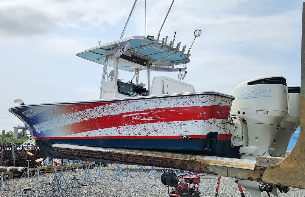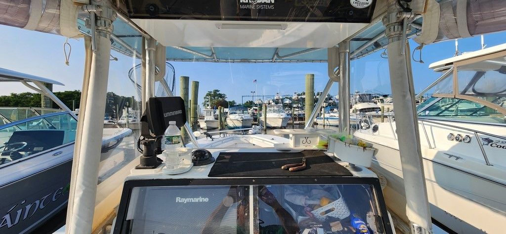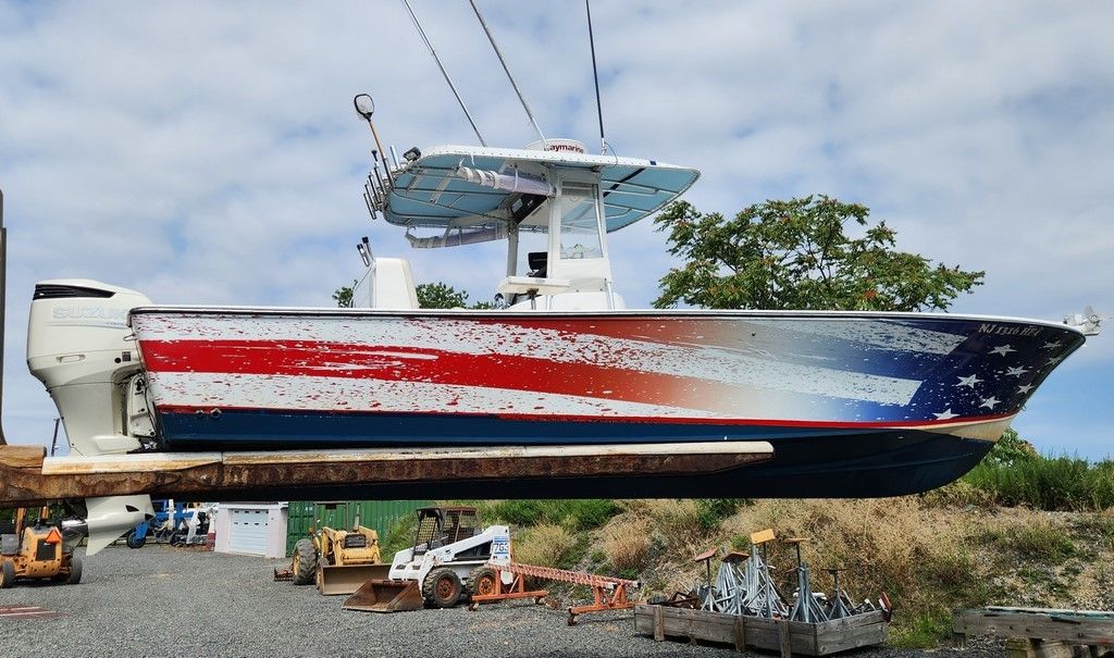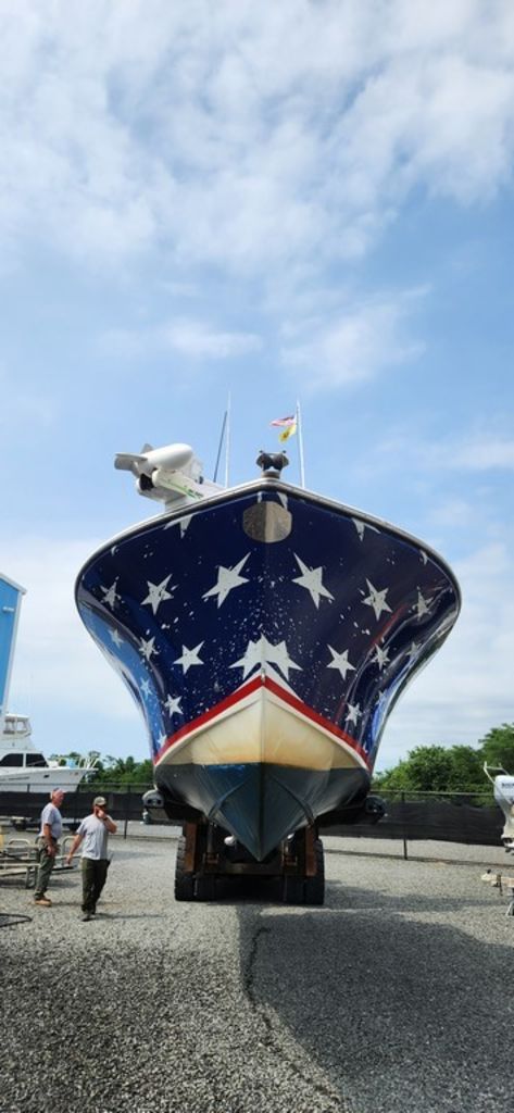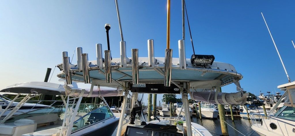 Vinyl T-Top with rocket launchers and 16-18 ft RUPP Outriggers. Custom American Flag Wrap on top of a dull blue gelcoat hull. I opted for the wrap for a more customized look vs painting. **For the right price, I am willing to include a NEW install of the same wrap or something based on your personal preference.