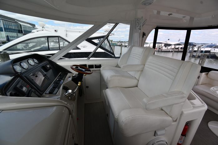 Freshwater / Great Lakes boat since new this vessel features Twin Cummins 480CE 480-hp Diesel Engine's with 950 original hours. Notable features include but are not limited to the following: Air-Conditioning & Heat (4-Units), (2) Heads (Vacuflush) w/Vanity/Sink/Stall-Shower's, Central Vacuum System, Washer/Dryer, Canvas Carpet Runners, Onan 9.0kw Generator, Windlass Anchor w/Forward Pedal Controls, Cockpit AC/Heat, Bow Thruster, Raymarine Electronics (VHF Marine Radio, Sum-Log w/Depth/Speed/Trip-Log, C120 Radar w/GPS/Chartplotter, Autoplotter), Cockpit Wet Bar w/Sink/Refrigerator, and MUCH more!