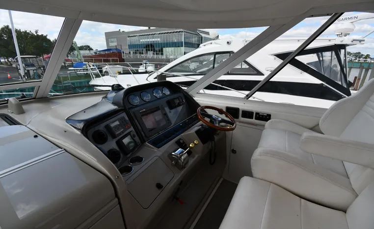 Freshwater / Great Lakes boat since new this vessel features Twin Cummins 480CE 480-hp Diesel Engine's with 950 original hours. Notable features include but are not limited to the following: Air-Conditioning & Heat (4-Units), (2) Heads (Vacuflush) w/Vanity/Sink/Stall-Shower's, Central Vacuum System, Washer/Dryer, Canvas Carpet Runners, Onan 9.0kw Generator, Windlass Anchor w/Forward Pedal Controls, Cockpit AC/Heat, Bow Thruster, Raymarine Electronics (VHF Marine Radio, Sum-Log w/Depth/Speed/Trip-Log, C120 Radar w/GPS/Chartplotter, Autoplotter), Cockpit Wet Bar w/Sink/Refrigerator, and MUCH more!