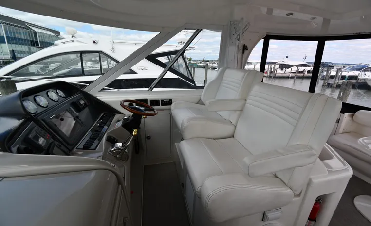 Freshwater / Great Lakes boat since new this vessel features Twin Cummins 480CE 480-hp Diesel Engine's with 950 original hours. Notable features include but are not limited to the following: Air-Conditioning & Heat (4-Units), (2) Heads (Vacuflush) w/Vanity/Sink/Stall-Shower's, Central Vacuum System, Washer/Dryer, Canvas Carpet Runners, Onan 9.0kw Generator, Windlass Anchor w/Forward Pedal Controls, Cockpit AC/Heat, Bow Thruster, Raymarine Electronics (VHF Marine Radio, Sum-Log w/Depth/Speed/Trip-Log, C120 Radar w/GPS/Chartplotter, Autoplotter), Cockpit Wet Bar w/Sink/Refrigerator, and MUCH more!