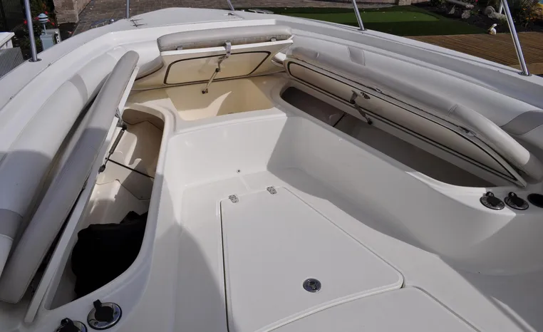 Features Twin Mercury 350-hp 4-Stroke Verado Motors w/Mercury DTS Controls and only 357 hours. (Re-powered in 2021) Notable features include but are not limited to the following: Enclosed Head (Vacuflush) w/Vanity/Sink, Windlass Anchor w/Polished Stainless Steel Anchor, Updated Twin Garmin (Color / Touchscreen) GPS w/Chartplotter, Remote Steering, Mercury SmartCraft, New Fusion Premium Sound System w/Upgraded JL Audio Marine Speaker's & Sub-woofer and a 6 Channel Amp (2024) (Note Helm Mounted Remote Control & Speaker's Mounted to Underside of Hard-top), New Group 31 Batteries (2024) Full Canvas Cover, 2008 Load Rite Aluminum Triple Axel Trailer Included and MUCH more!