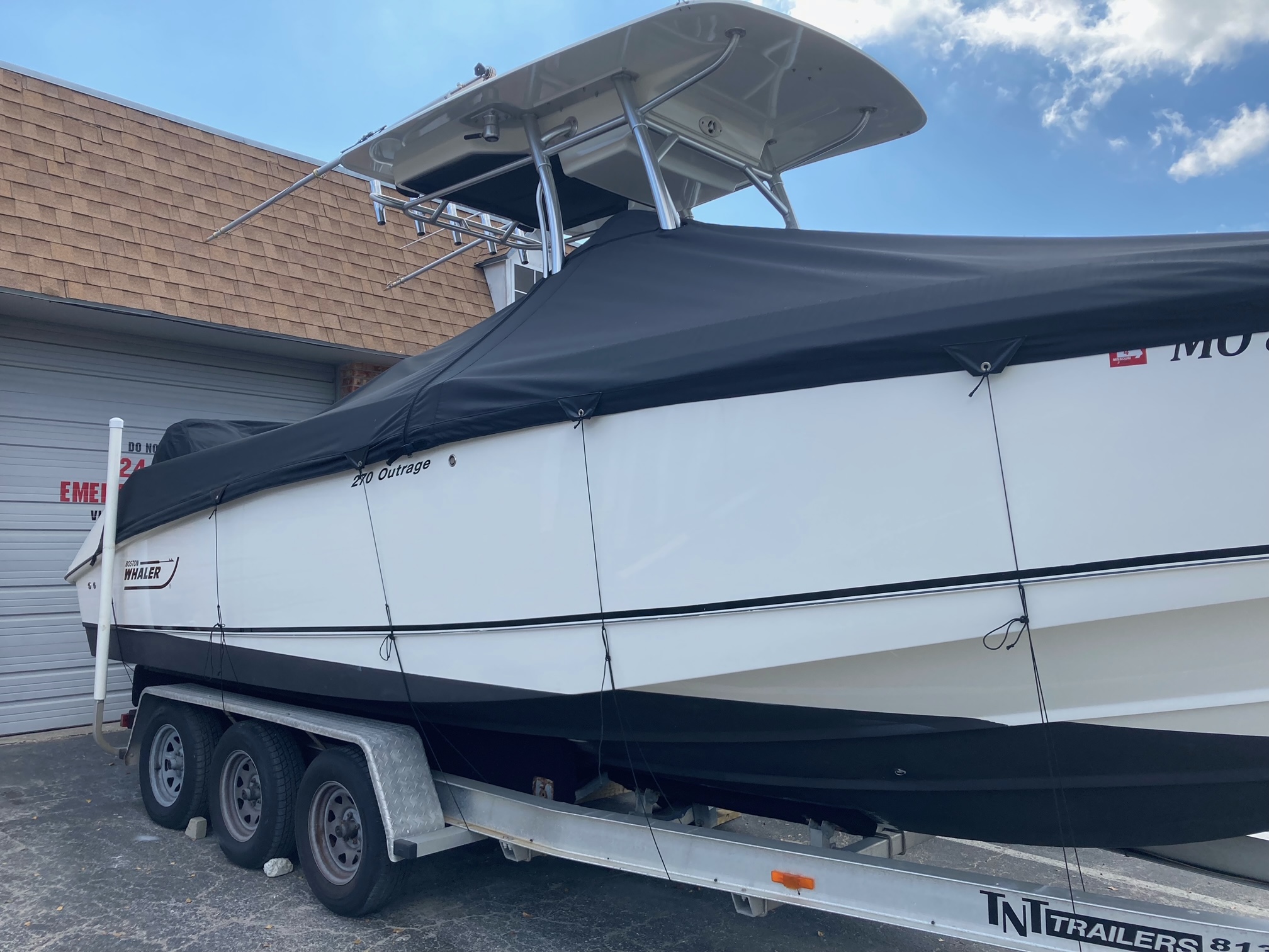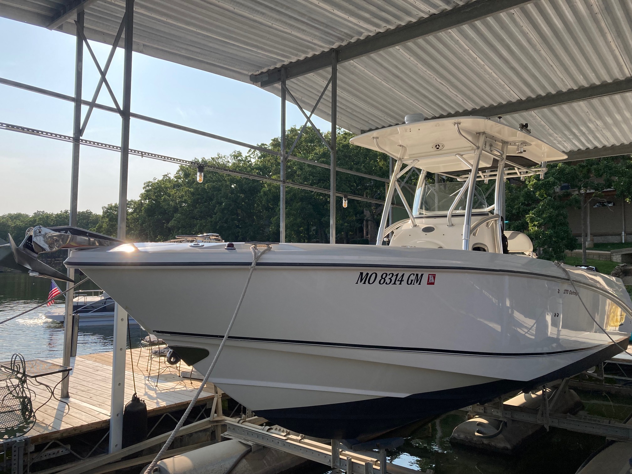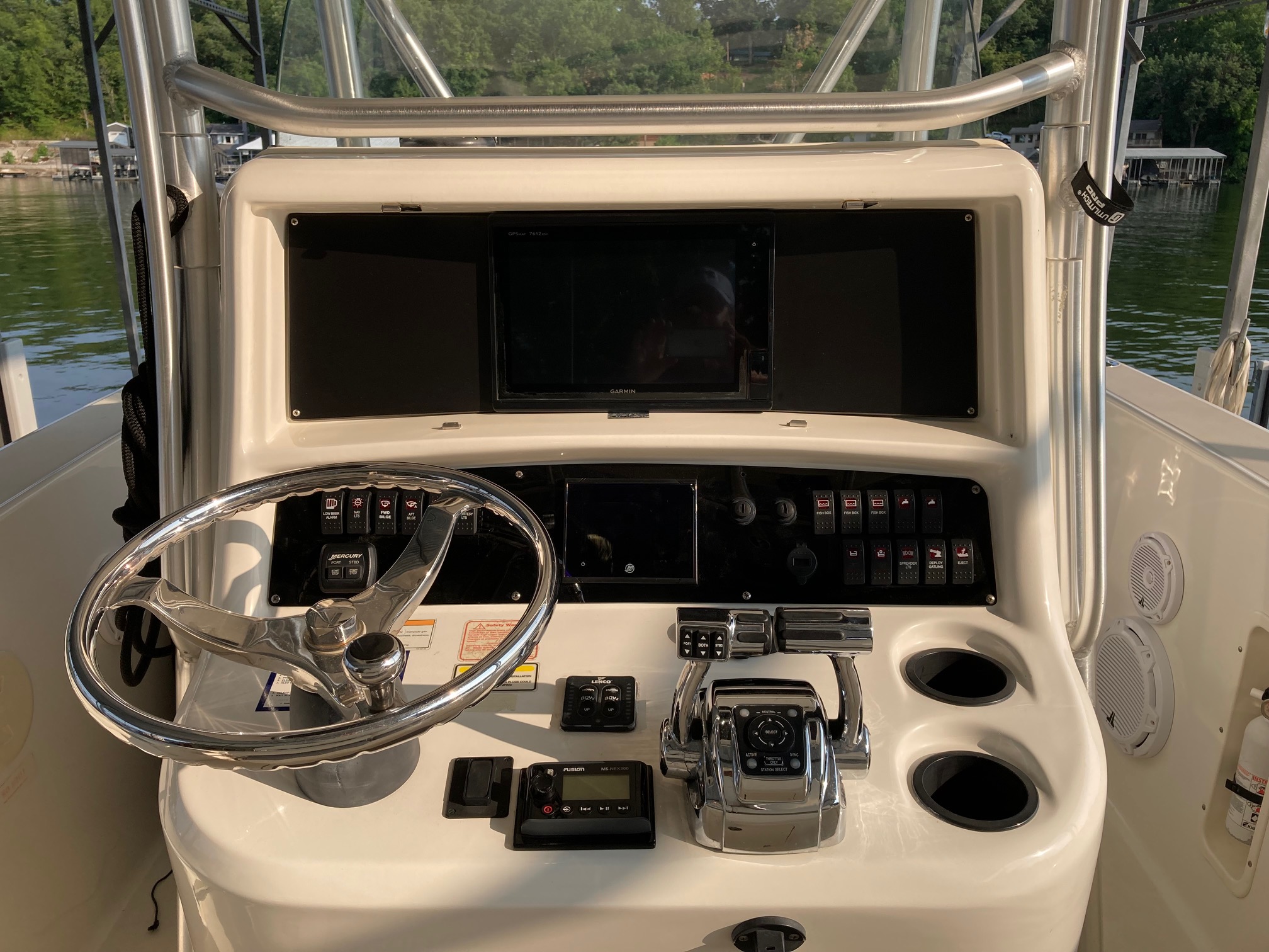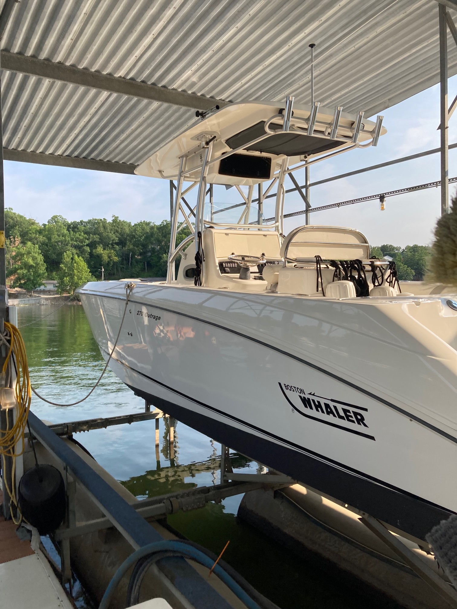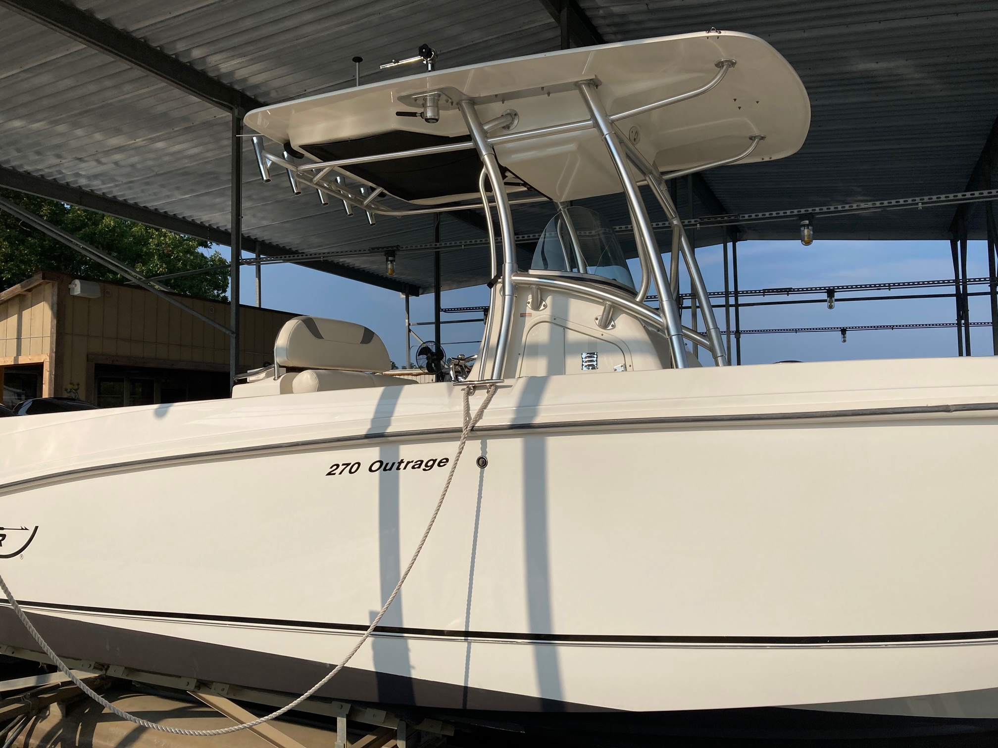 From its low-profile bow rail to its integral boarding platform, the Boston Whaler 270 Outrage incorporates sleek lines plus a host of fishing-friendly features and comfort options. This remarkable boat includes three in-deck insulated storage / fishboxes, a lockable console (including an enclosed portable head with pump-out and freshwater sink), locking bow rod storage and a lighted 23-gallon transom livewell with raw-water fill. There’s a total of 10 rod racks and 11 rod holders located throughout the boat. The 334-quart in-deck bow storage compartment features a drain and a pump-out so it can double as a third insulated fishbox. The leaning post features two rod holders, a well-equipped bait prep station and a stainless steel grab rail, with a 94-quart cooler below. Versatile seating includes two bow bench seats with standard removable cushions; a leaning post with a removable backrest, folding footrest and twin hinging seat bases for convenient storage access; a molded seat in front of the console; and a convenient stern bench seat that folds into the transom. Trailer included.