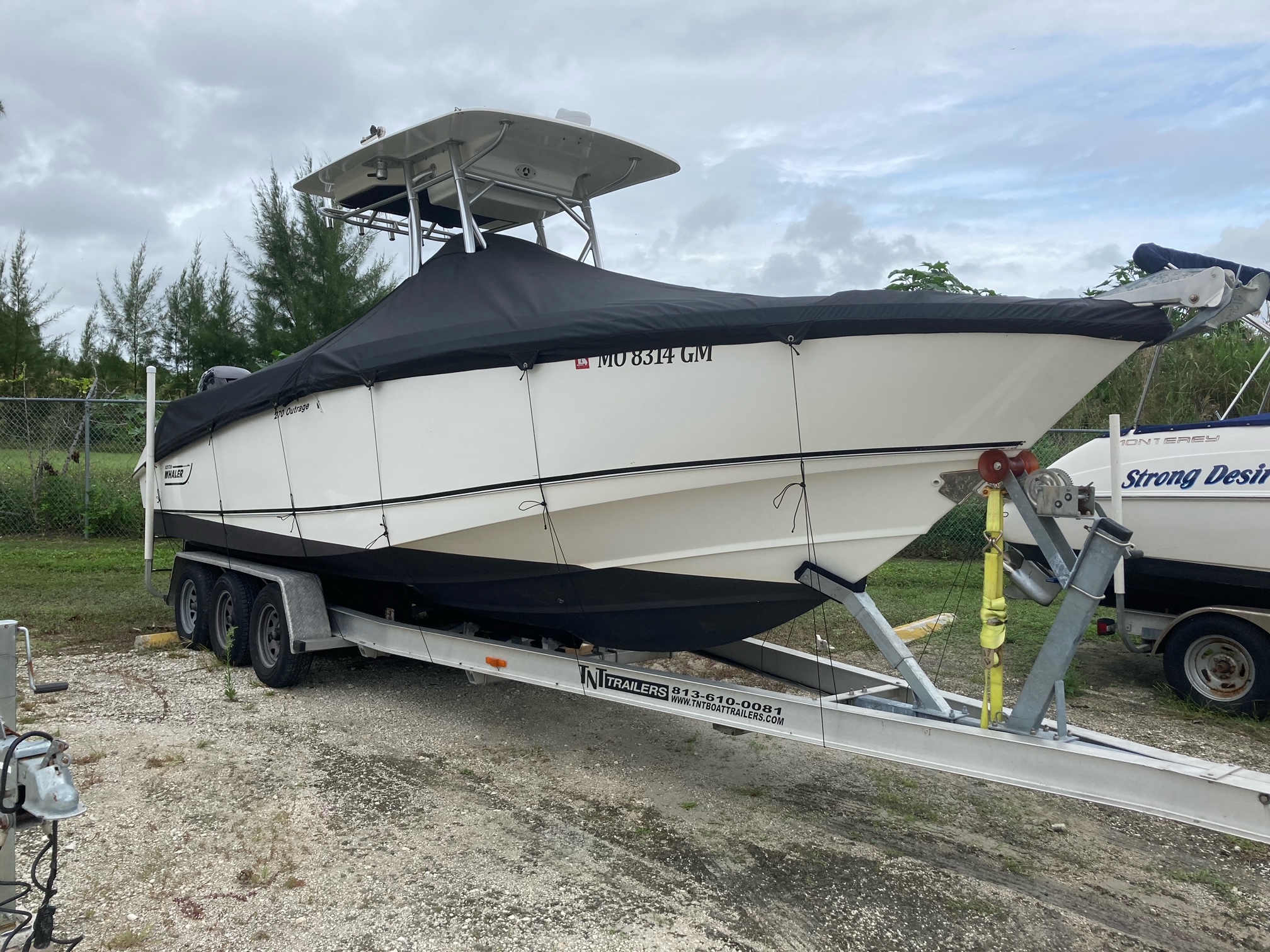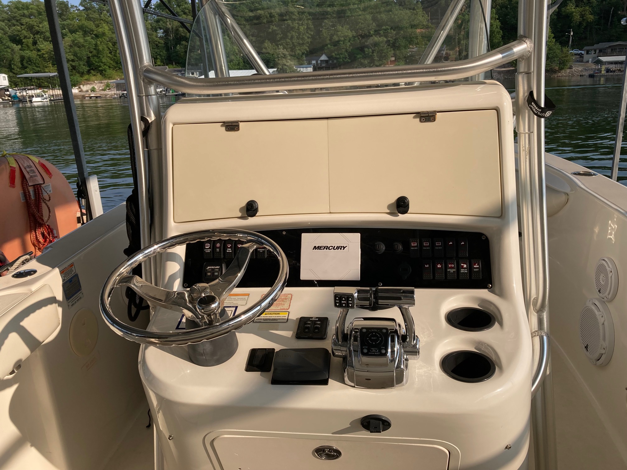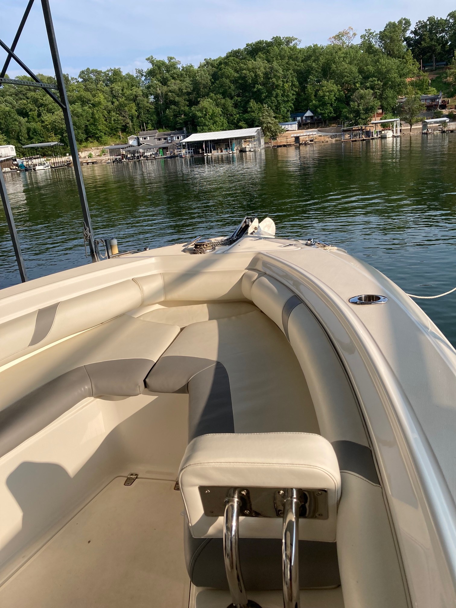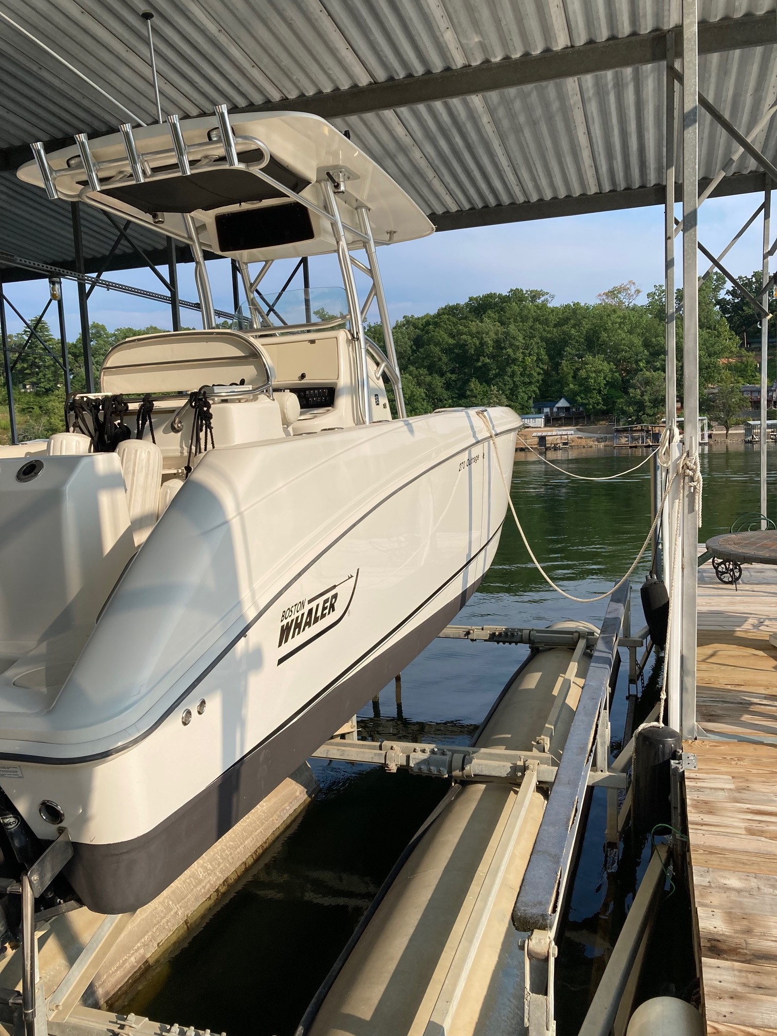 From its low-profile bow rail to its integral boarding platform, the Boston Whaler 270 Outrage incorporates sleek lines plus a host of fishing-friendly features and comfort options. This remarkable boat includes three in-deck insulated storage / fishboxes, a lockable console (including an enclosed portable head with pump-out and freshwater sink), locking bow rod storage and a lighted 23-gallon transom livewell with raw-water fill. There’s a total of 10 rod racks and 11 rod holders located throughout the boat. The 334-quart in-deck bow storage compartment features a drain and a pump-out so it can double as a third insulated fishbox. The leaning post features two rod holders, a well-equipped bait prep station and a stainless steel grab rail, with a 94-quart cooler below. Versatile seating includes two bow bench seats with standard removable cushions; a leaning post with a removable backrest, folding footrest and twin hinging seat bases for convenient storage access; a molded seat in front of the console; and a convenient stern bench seat that folds into the transom. Trailer included.