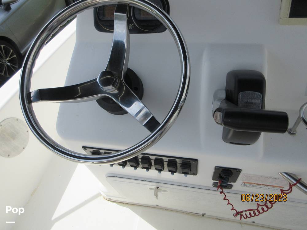 Powered by a four stroke Yamaha 115 outboard and it also has a Minn-Kota trolling motor. Also features a Bimini top, leaning post/ cooler seat, and dual live bait wells.