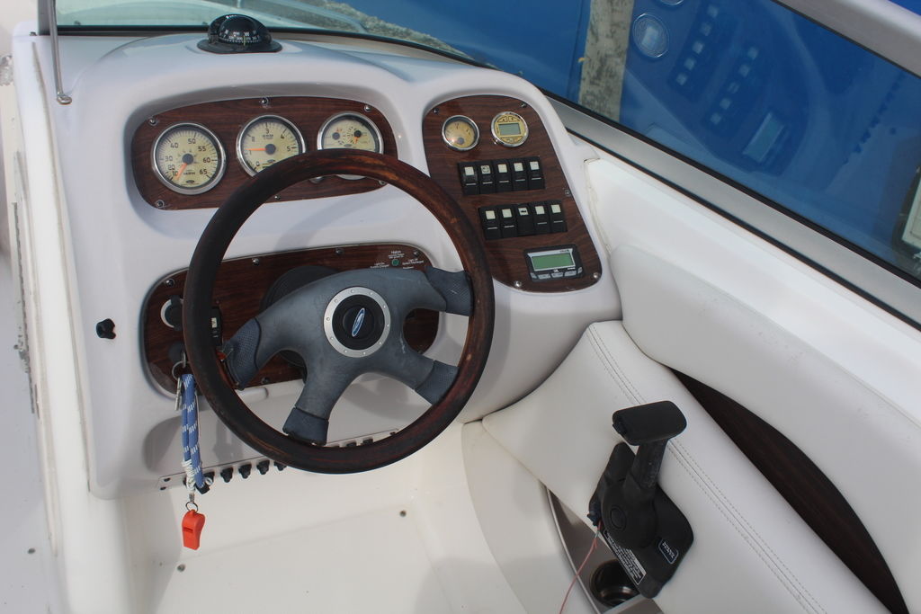 A notable feature of the Chaparral 256 SSi is its enclosed head compartment, providing privacy and convenience for longer outings — a feature not always found in boats of this size. The helm is well laid out with clear instrumentation, supportive seating, and intuitive controls for an enjoyable driving experience.
