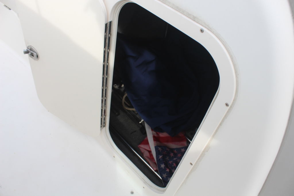 The cockpit layout is spacious and designed with comfort in mind. Wraparound seating aft provides ample room for guests, while the bow features forward lounges that can easily convert into sun pads for relaxing at anchor. A removable cockpit table adds versatility for dining or entertaining, and a Bimini top offers shade when needed. Storage is plentiful throughout the boat, keeping gear neatly stowed and out of the way.