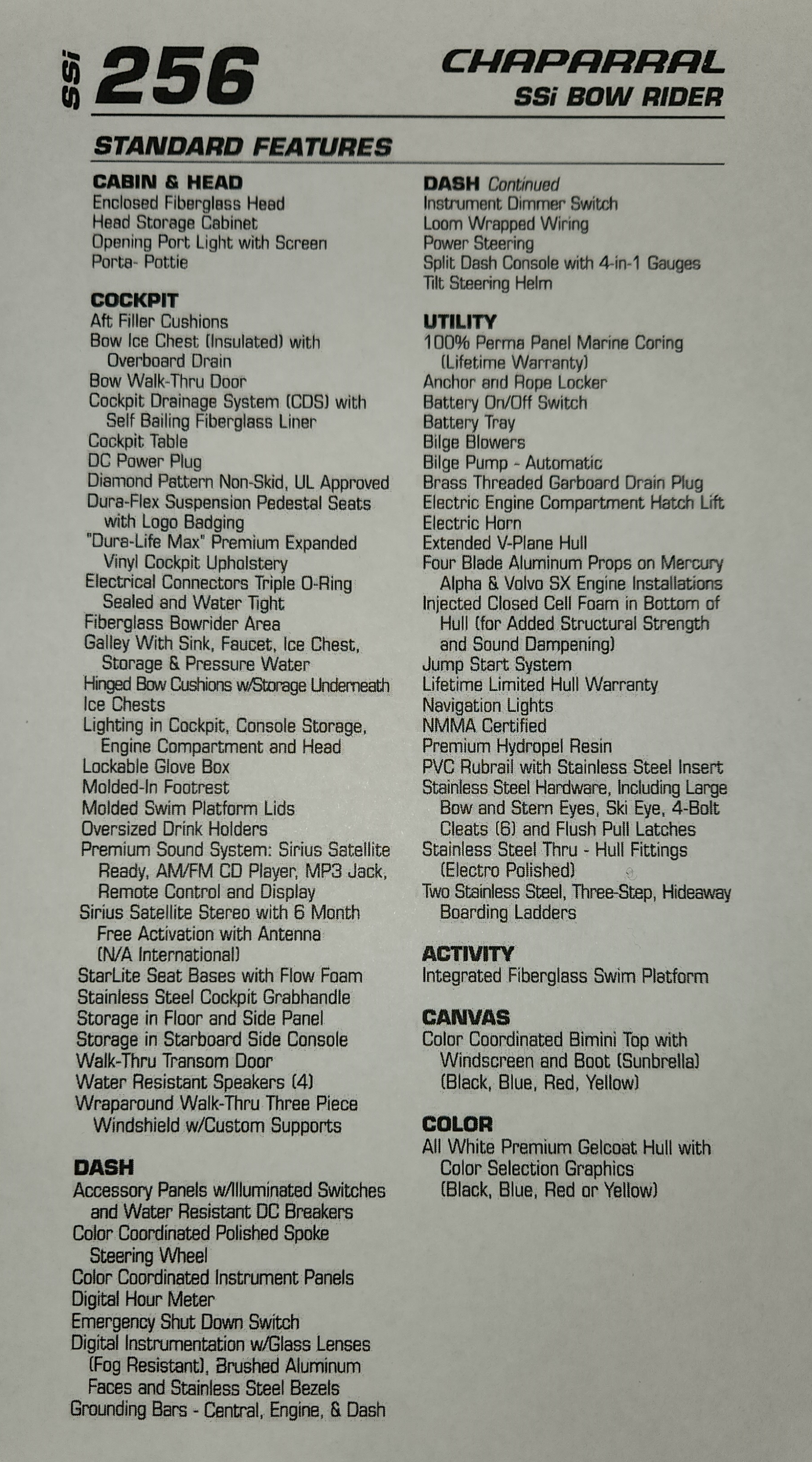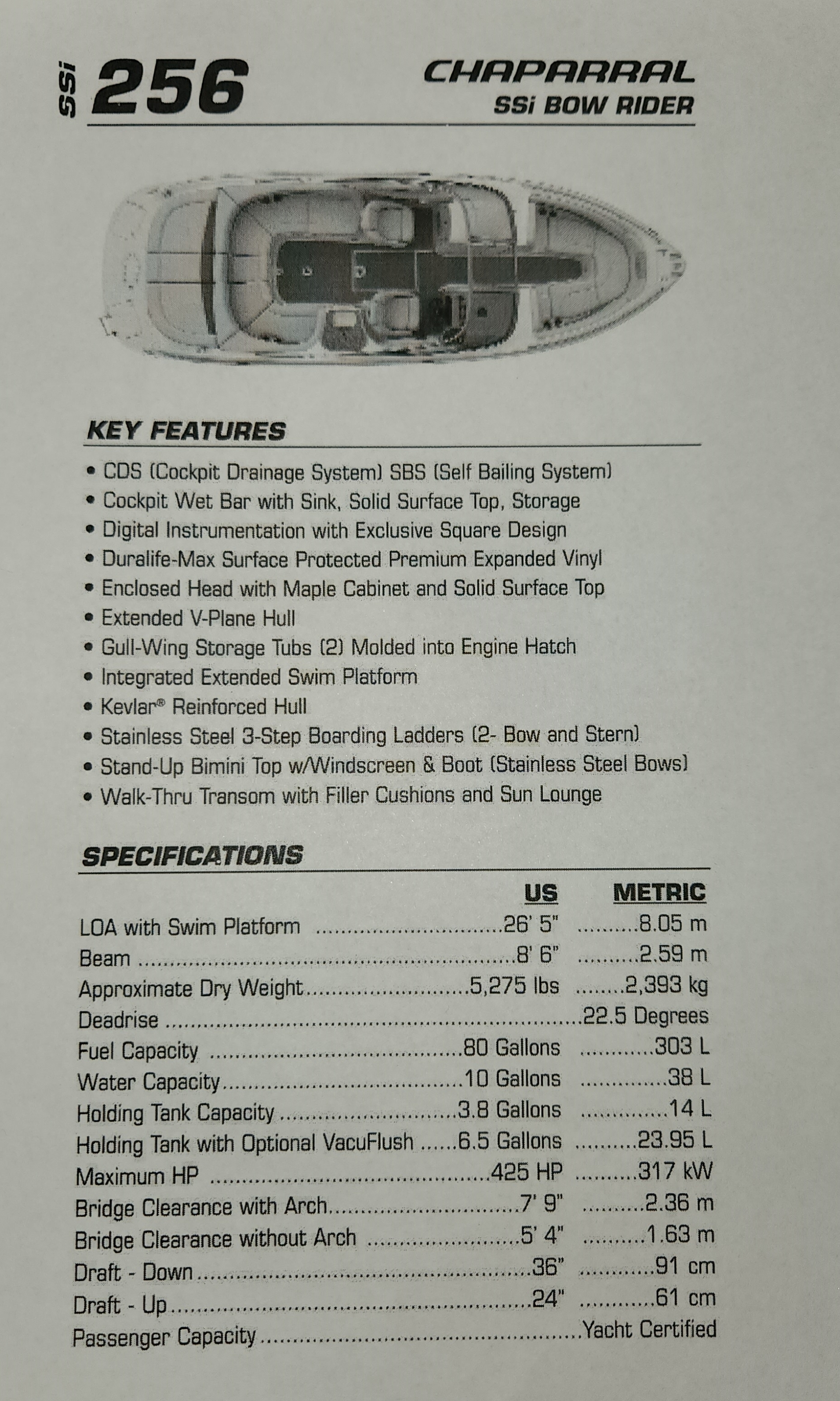 ***SERIOUS INQUIRIES ONLY*** 2006 Chaparral 256 SSi "The Ultimate Advantage" Beautiful 26.5 foot Yacht Certified Chaparral in excellent condition with double-axle Magnum trailer. Trailer installed with new bunk guides and spare tire. Mercury Mercruiser 350 Mag Motor -- only 250+ hours on the lake. Original owner. Boat kept in immaculate condition. Custom snap-down canvas cover for bow and cockpit and added custom made WeatherMAX outdoor performance fabric canvas cover (and storage bag) which gives extra protection from sun, snow, rain, wind and dirt (completely covers top of boat from bow to stern-not shown). Gally with Granite-top Wet Bar with Sink , Faucet, Storage and pressured Water. Digital Instrumentation. Enclosed Head, maple cabinet and storage, shelves. Extended V-Plane Hull. Gull-Wing Storage Tubs molded into Engine Hatch. Integrated Extended Swim Platform. Kevlar Reinforced Hull. 2 Stainless Steel 3-Step Boarding Ladders(bow and stern). Stand-Up Bimini Top w/ Windscreen & Boot. Walk-Thru Transom with Filler Cushions and Sun Lounge. Bow Walk-Thru Door. Storage in Floor and Side Panels. Insulated Bow Ice Chest with overflow drain. Cockpit Drainage System. Plenty of storage including under floor Wet storage compartment. Cockpit Table and Extra Cushions for Sleep area. Hinged Bow Cushions with Storage Underneath. Premium Sound System. Diamond Pattern Non-Skid Floor with Removable Snap-In Carpet. Premium Expanded Vinyl Upholstery.