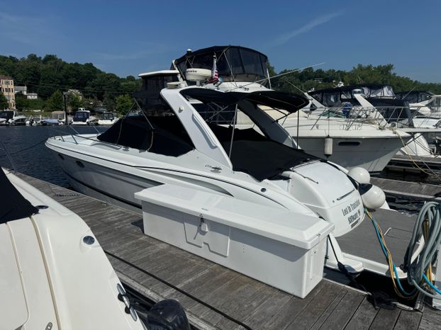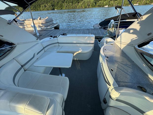The cockpit is built for entertainment, featuring wraparound lounge seating, a wet bar, and an extended swim platform. Below deck, you'll find a finely appointed cabin with high-gloss cabinetry, a full galley, a convertible dinette, and a private aft sleeping area—ideal for overnight trips. The air-conditioned interior is stylish, roomy, and designed for comfort.