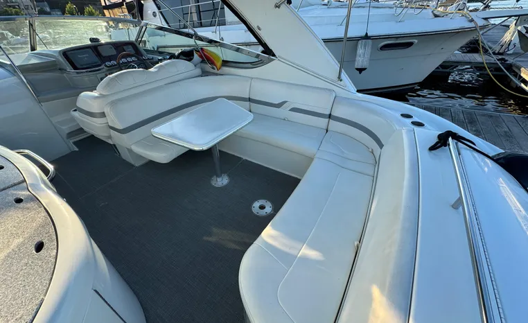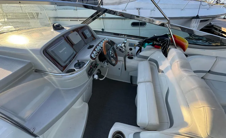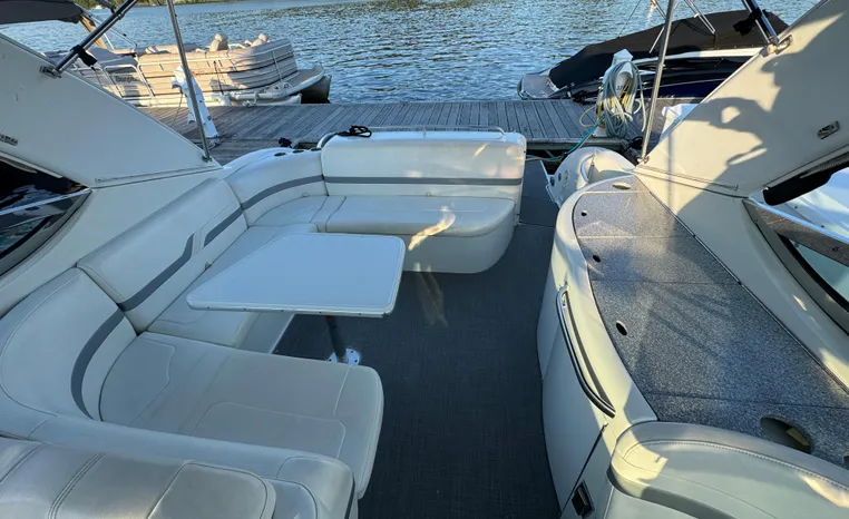The cockpit is built for entertainment, featuring wraparound lounge seating, a wet bar, and an extended swim platform. Below deck, you'll find a finely appointed cabin with high-gloss cabinetry, a full galley, a convertible dinette, and a private aft sleeping area—ideal for overnight trips. The air-conditioned interior is stylish, roomy, and designed for comfort.