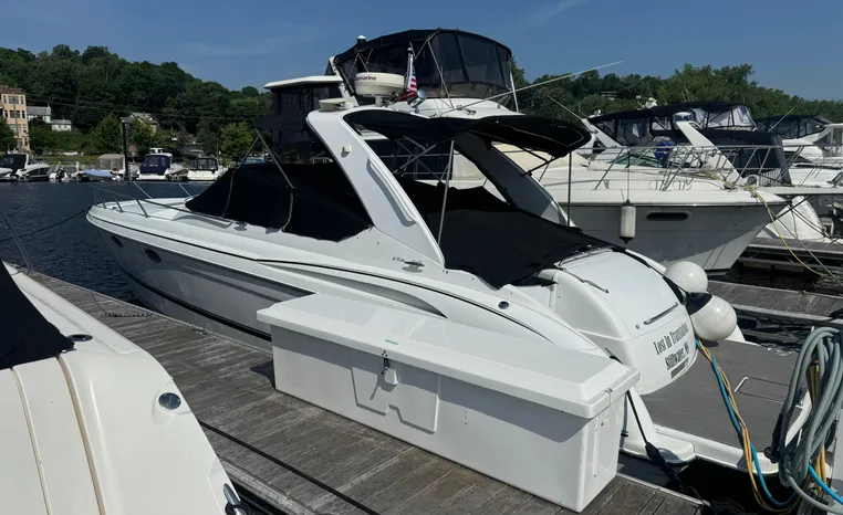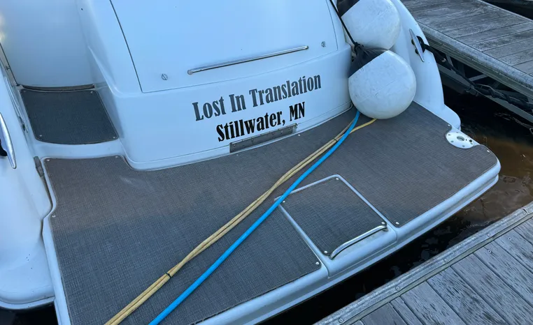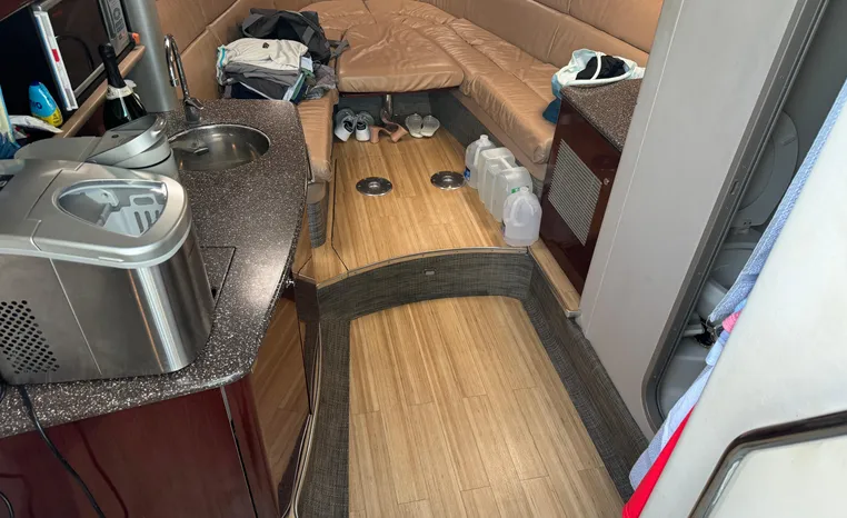 The cockpit is built for entertainment, featuring wraparound lounge seating, a wet bar, and an extended swim platform. Below deck, you'll find a finely appointed cabin with high-gloss cabinetry, a full galley, a convertible dinette, and a private aft sleeping area—ideal for overnight trips. The air-conditioned interior is stylish, roomy, and designed for comfort.