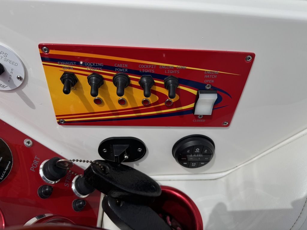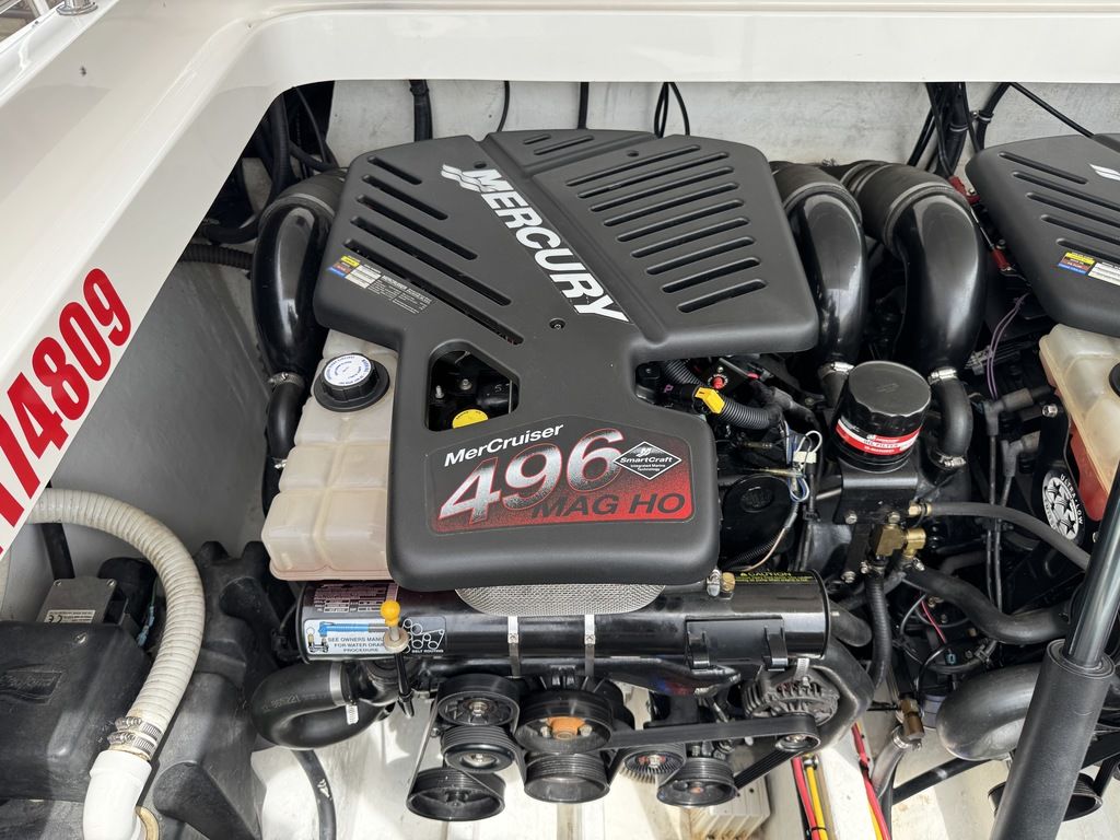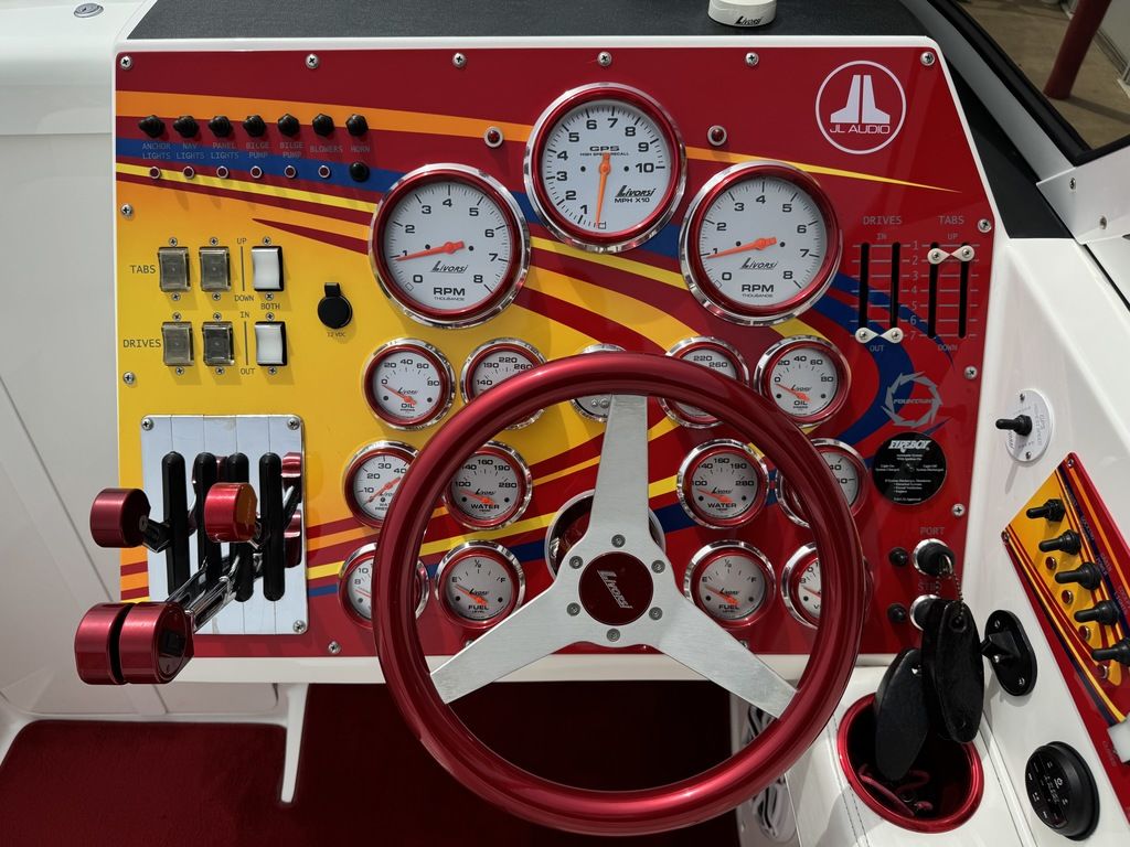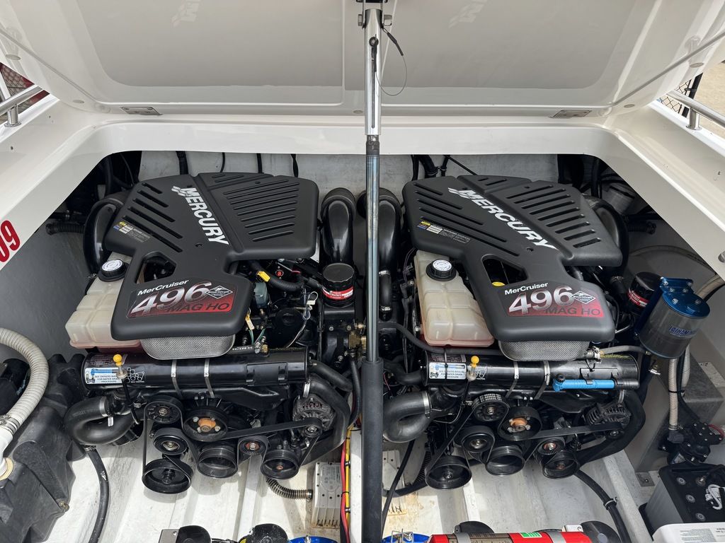 Shore power, built in battery charger, cabin refrigerator, sink, pump out head with macerator, upgraded JL audio sound system added in 2024, LED accent lighting, 300 hour service on engines 5 hours ago, drives full service 5 hours ago, full paint correction and ceramic coating, electric bolsters, livorsi gauges, livorsi steering wheel, trim and tab indicators, GPS speedometer, swim ladder, and much more!