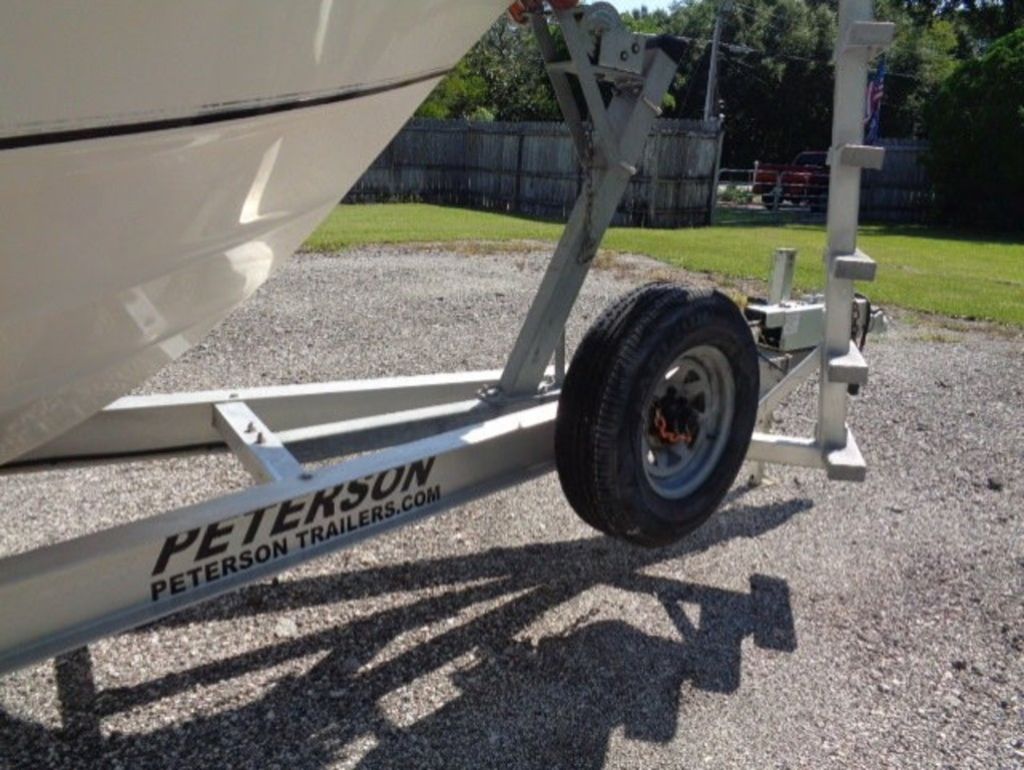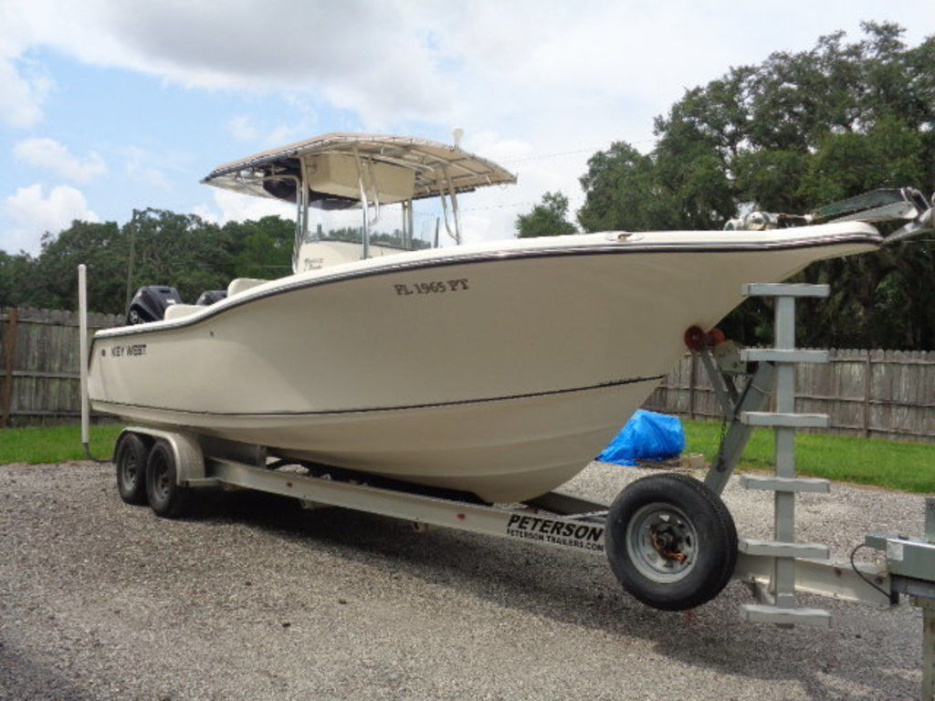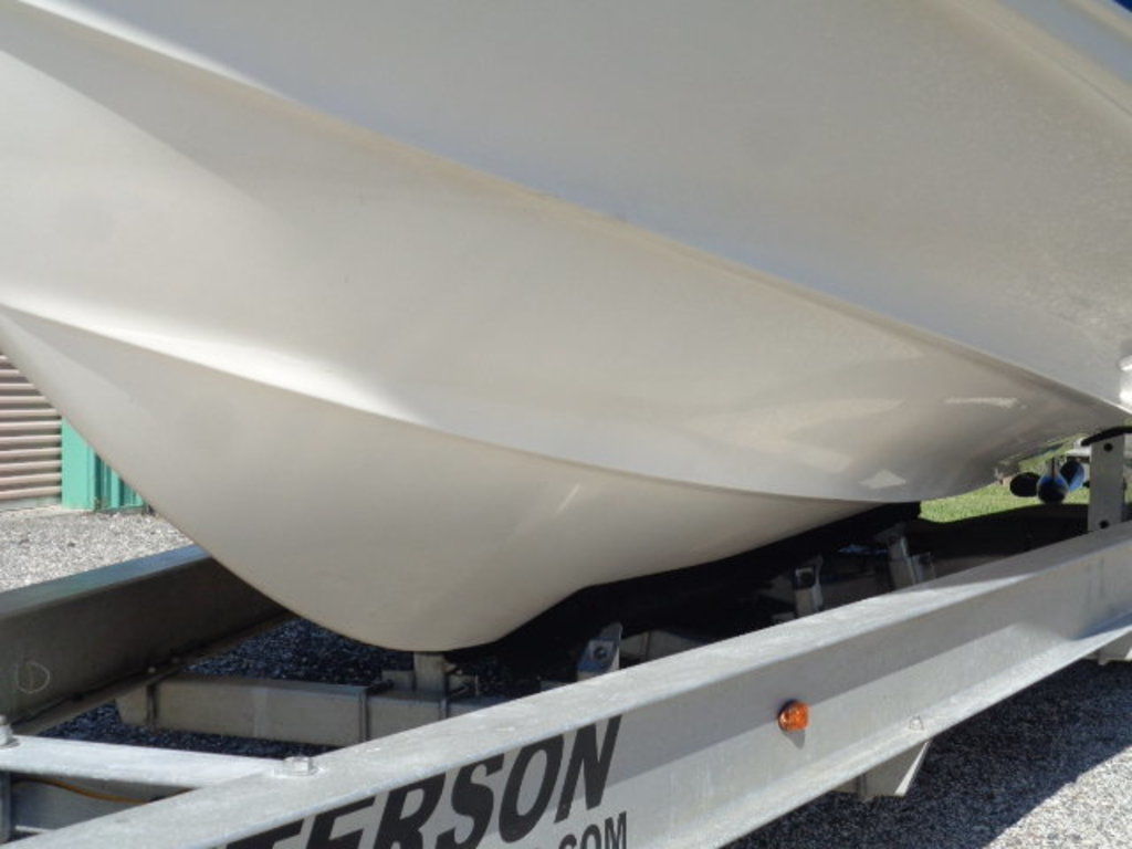 The boat is 26ft-8in overall. From the tongue of the trailer to the end of the motors is 32ft. It has a nice spacious 9ft-8in beam. The boat with the new Tohatsus weighs in around 8,000 lbs. Hull weight of the bare hull is 4550 lbs.