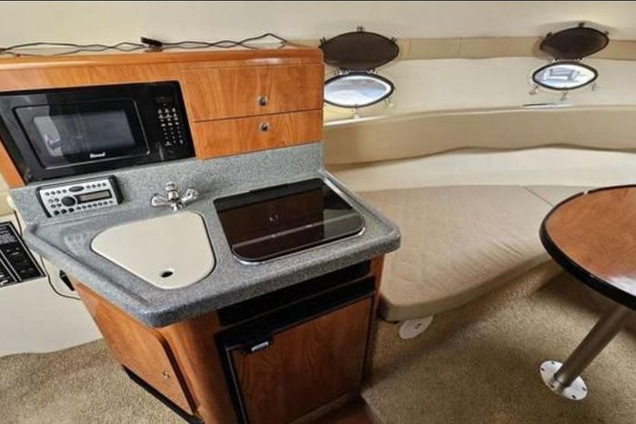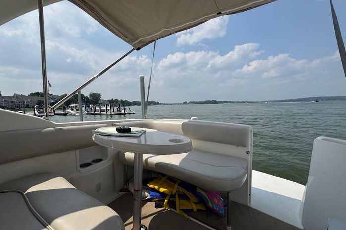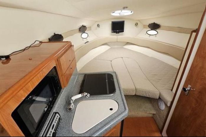 Larson is definitely moving boating forward with the Cabrio 274 and this innovative deck design. It molds the boarding platform with the hull and deck for a sleeker design that also expands the cockpit. Add that to the state-of-the-art patented Duo-Delta Conic notched hull and watch it soar, enthusiastically. The cabin offers 6 feet 2 inches of generous headroom, and a large round hatch over the dinette offers an abundant amount of light. The galley makes you feel at home with a Granulon counter and sink, full capacity cabinets trimmed in rich cherry laminate, a single-burner stove and refrigerator.