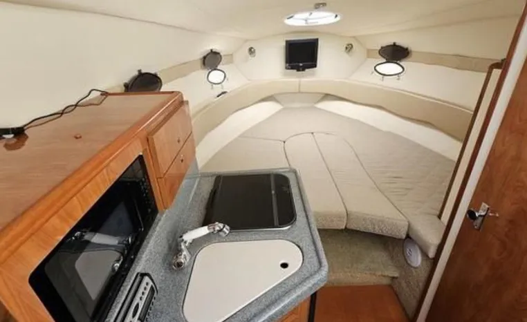Larson is definitely moving boating forward with the Cabrio 274 and this innovative deck design. It molds the boarding platform with the hull and deck for a sleeker design that also expands the cockpit. Add that to the state-of-the-art patented Duo-Delta Conic notched hull and watch it soar, enthusiastically. The cabin offers 6 feet 2 inches of generous headroom, and a large round hatch over the dinette offers an abundant amount of light. The galley makes you feel at home with a Granulon counter and sink, full capacity cabinets trimmed in rich cherry laminate, a single-burner stove and refrigerator.
