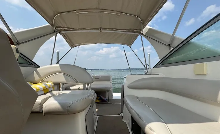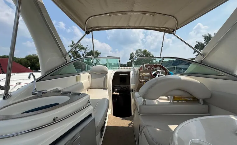 Larson is definitely moving boating forward with the Cabrio 274 and this innovative deck design. It molds the boarding platform with the hull and deck for a sleeker design that also expands the cockpit. Add that to the state-of-the-art patented Duo-Delta Conic notched hull and watch it soar, enthusiastically. The cabin offers 6 feet 2 inches of generous headroom, and a large round hatch over the dinette offers an abundant amount of light. The galley makes you feel at home with a Granulon counter and sink, full capacity cabinets trimmed in rich cherry laminate, a single-burner stove and refrigerator.