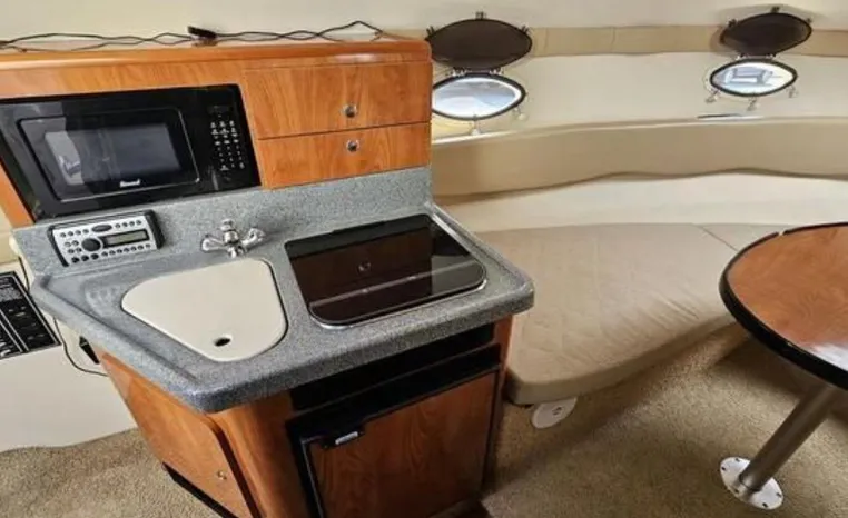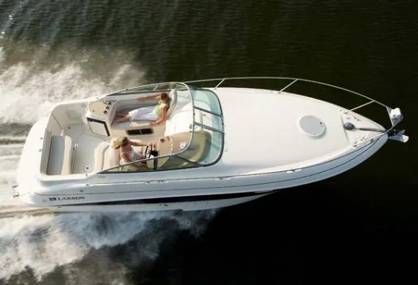 Larson is definitely moving boating forward with the Cabrio 274 and this innovative deck design. It molds the boarding platform with the hull and deck for a sleeker design that also expands the cockpit. Add that to the state-of-the-art patented Duo-Delta Conic notched hull and watch it soar, enthusiastically. The cabin offers 6 feet 2 inches of generous headroom, and a large round hatch over the dinette offers an abundant amount of light. The galley makes you feel at home with a Granulon counter and sink, full capacity cabinets trimmed in rich cherry laminate, a single-burner stove and refrigerator.