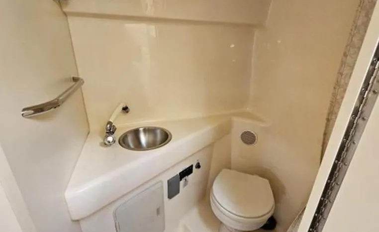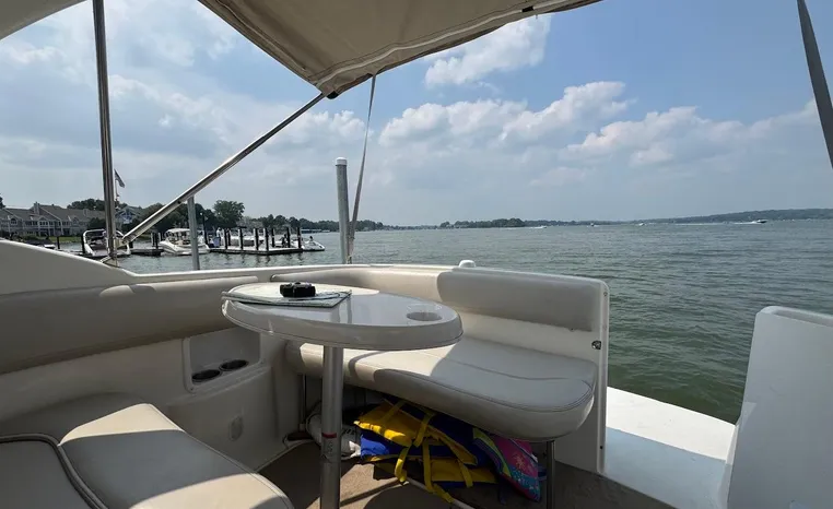 Larson is definitely moving boating forward with the Cabrio 274 and this innovative deck design. It molds the boarding platform with the hull and deck for a sleeker design that also expands the cockpit. Add that to the state-of-the-art patented Duo-Delta Conic notched hull and watch it soar, enthusiastically. The cabin offers 6 feet 2 inches of generous headroom, and a large round hatch over the dinette offers an abundant amount of light. The galley makes you feel at home with a Granulon counter and sink, full capacity cabinets trimmed in rich cherry laminate, a single-burner stove and refrigerator.