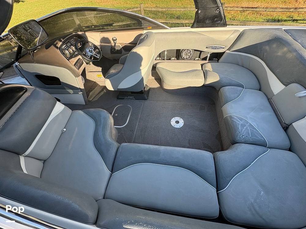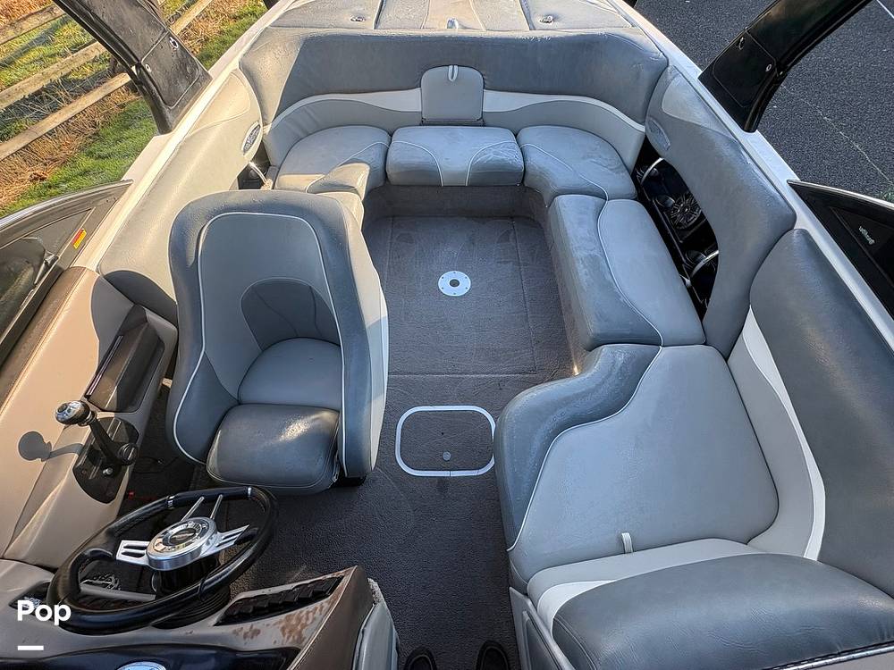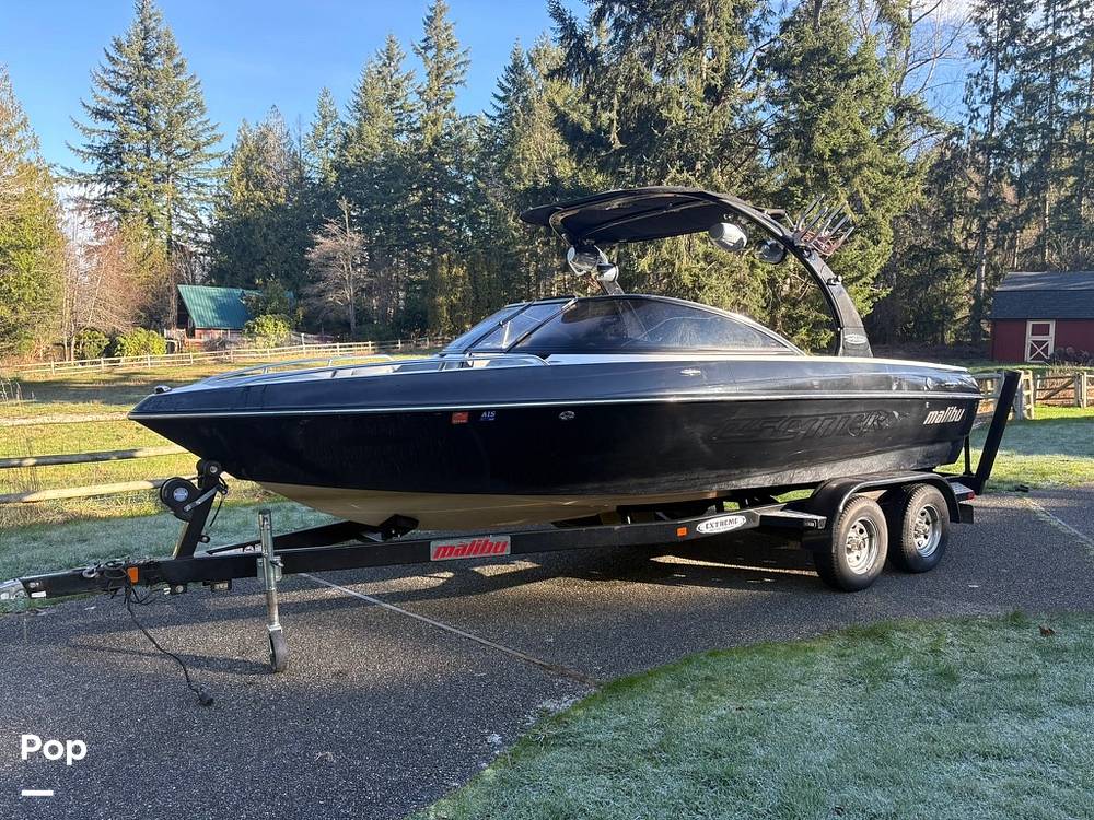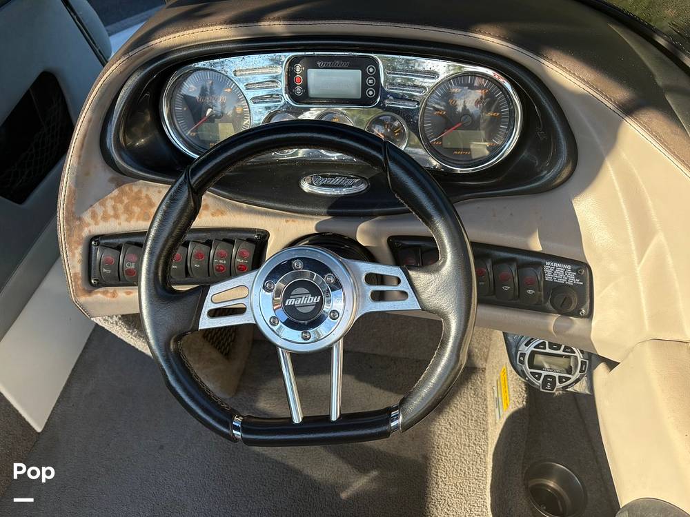 The interior features updated upholstery along with standard Malibu components such as pull-up cleats and a swim platform. Storage compartments and seating configurations remain practical for group outings or sessions behind the boat.