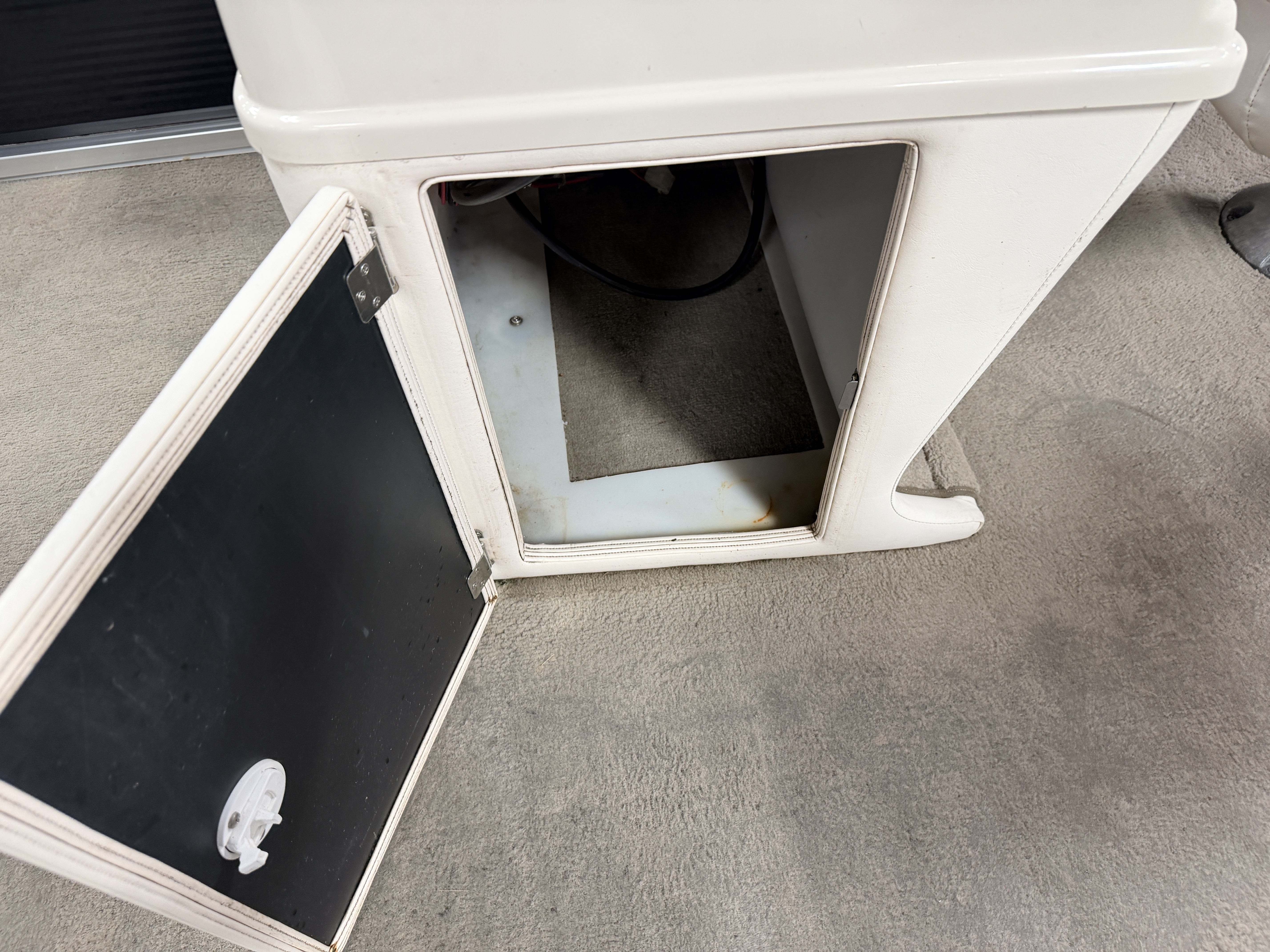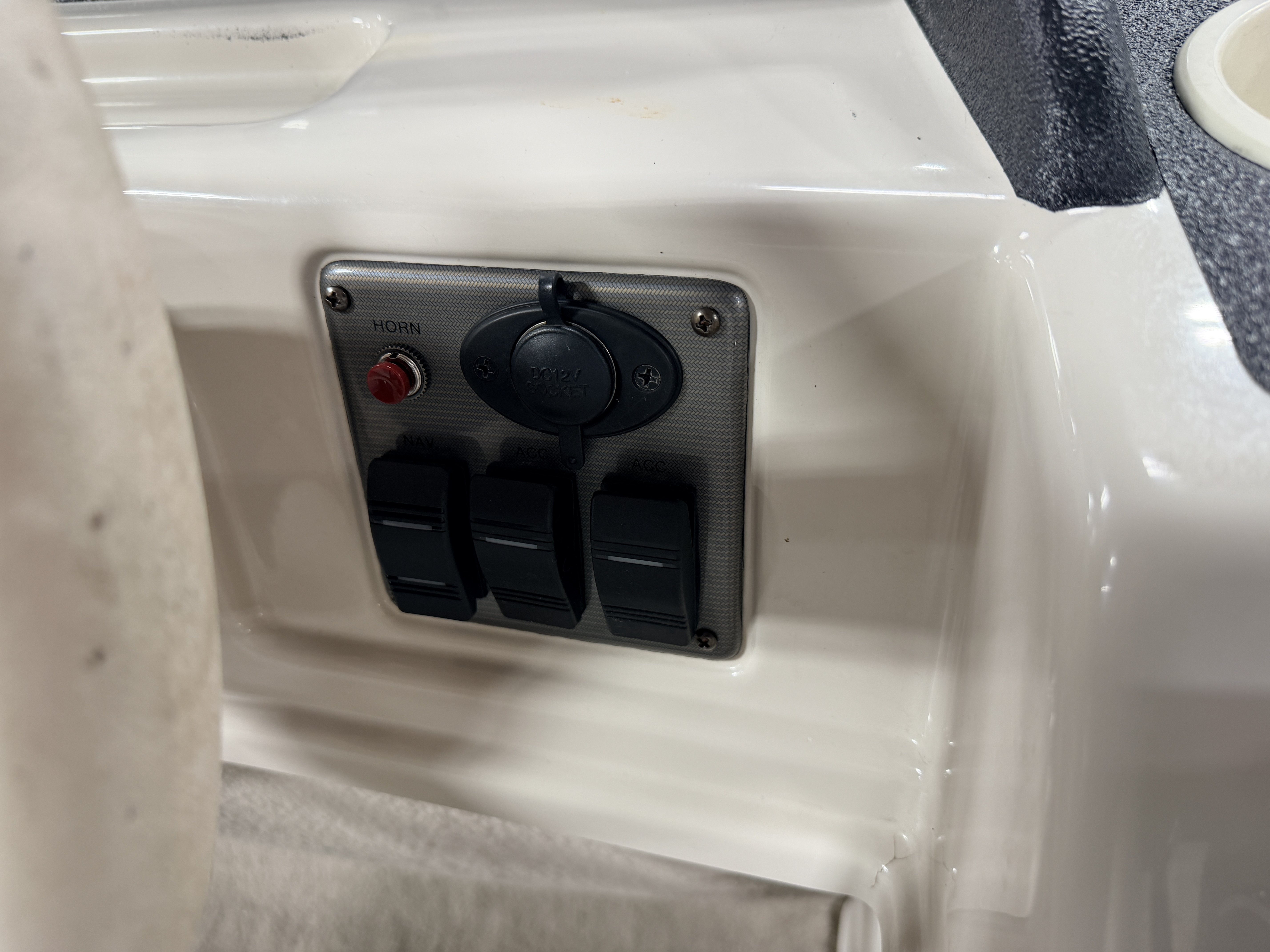 2006 Misty Harbor 1880 CF Explorer Pontoon with 40HP Mercury Fourstroke EFI Outboard. This quad fish, or four corner, fishing pontoon features 4 fishing seats; 1 in each corner of the pontoon. There are 3 entry gates on-board; 1 in the front, and 1 on each side, behind the fishing seats. There is a L-shaped couch with table amidships on the port side. The helm on the starboard side features a Tachometer, and an access door on the side of the helm to store items or access the wiring in the helm. The captain's chair is a low back sport seat with swivel and slide functions. The rear fishing seats have a livewell between them with a cushioned lid which could also be sat upon. There are consoles on each side with a cup holder in each. The port side has a portable fuel tank in the console and the other holds the starting battery and has room for more storage.
