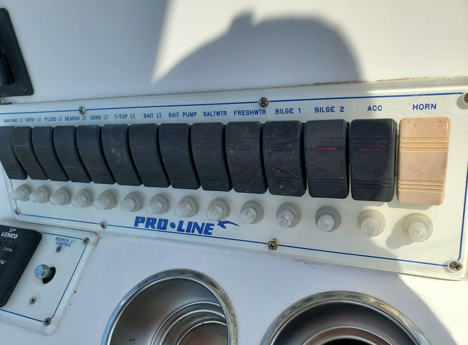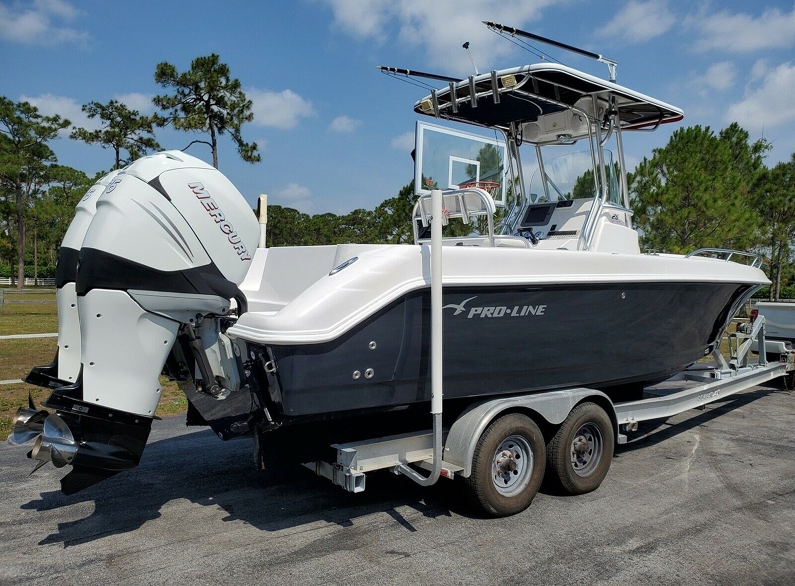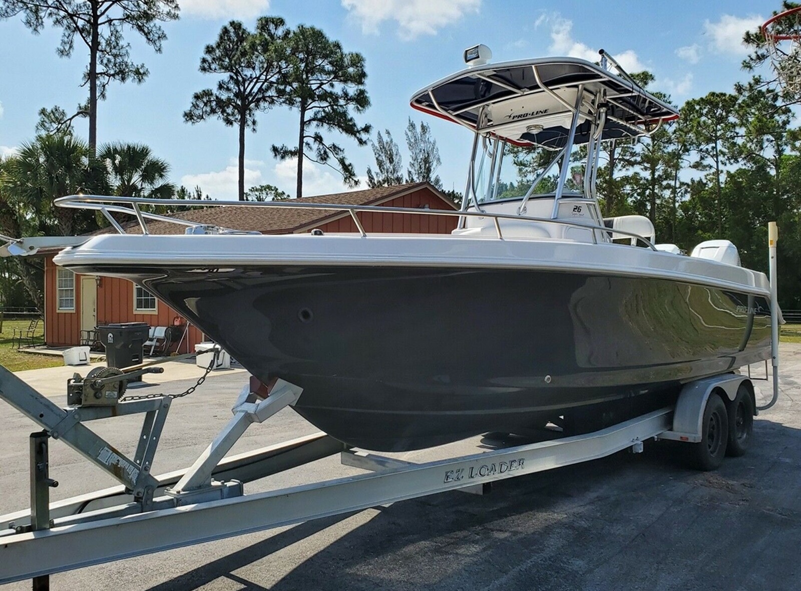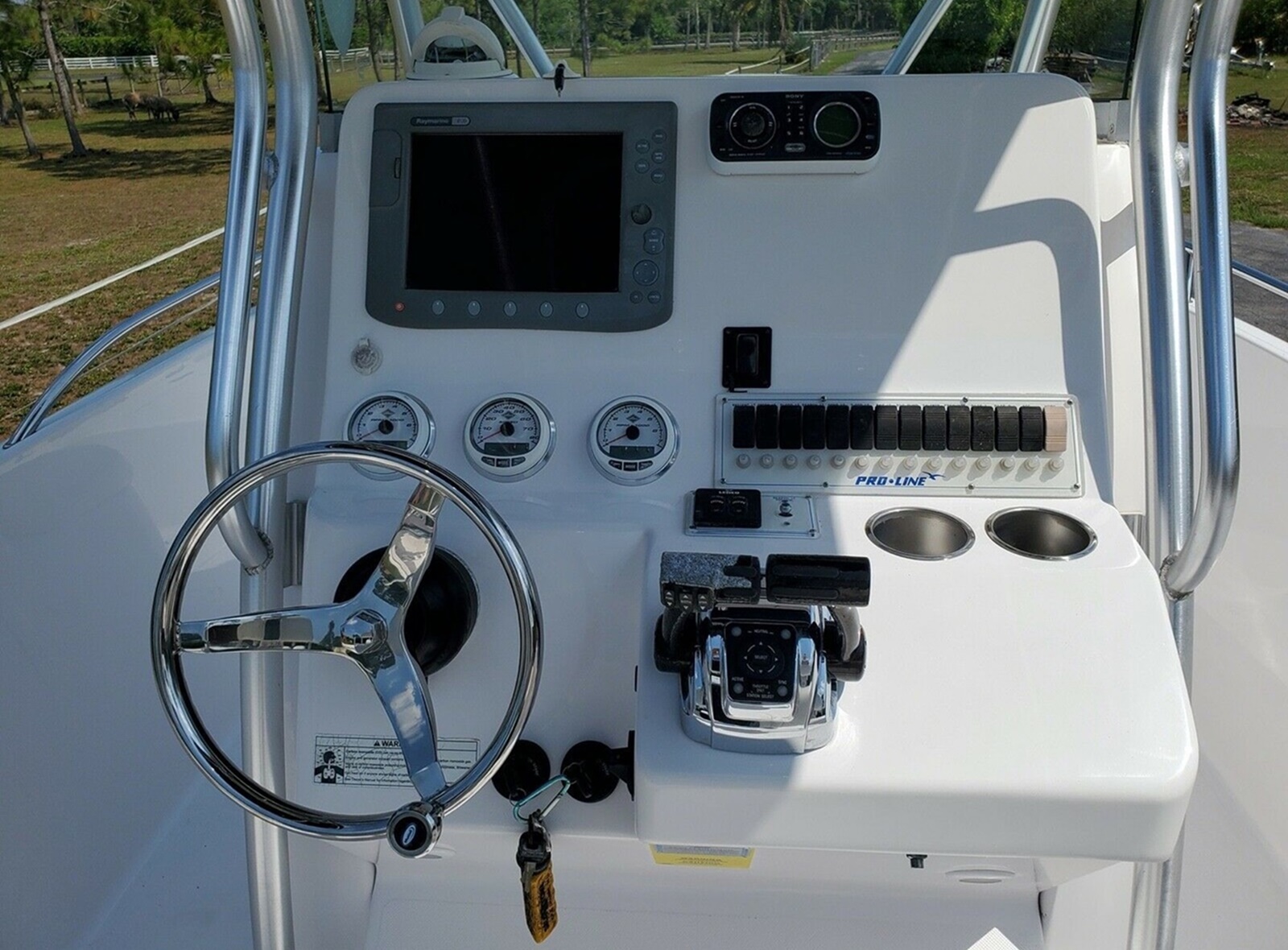 This 2006 Proline 26 Super Sport Center Console, used in freshwater, is in excellent condition. It comes equipped with stainless steel props, drop-down bolster helm seats, an electronics box, Ray Marine C-120 GPS, rocket launchers, CD/stereo, compass, electric anchor windlass, two large fish boxes, a 42-gallon baitwell, flip-down aft seating, trim tabs, swim ladder, gunnel rod holders, and a raw water washdown.