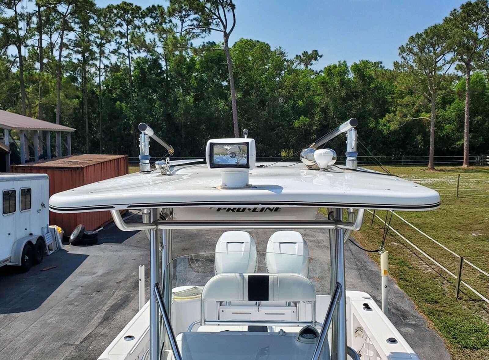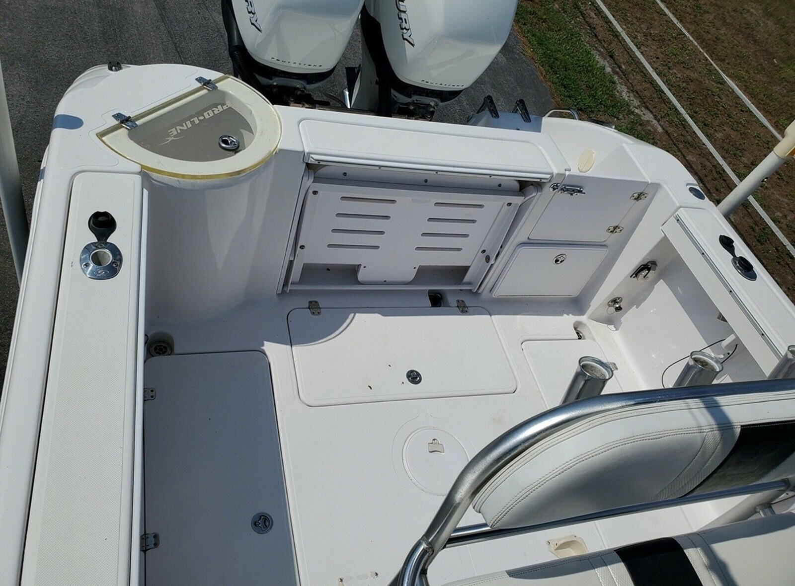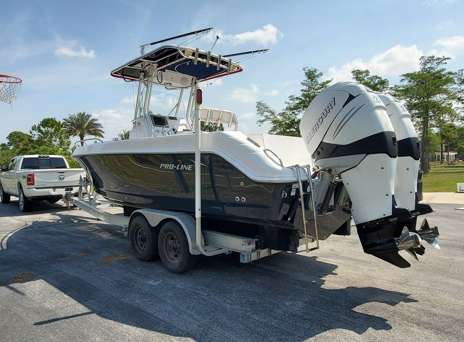 This 2006 Proline 26 Super Sport Center Console, used in freshwater, is in excellent condition. It comes equipped with stainless steel props, drop-down bolster helm seats, an electronics box, Ray Marine C-120 GPS, rocket launchers, CD/stereo, compass, electric anchor windlass, two large fish boxes, a 42-gallon baitwell, flip-down aft seating, trim tabs, swim ladder, gunnel rod holders, and a raw water washdown.