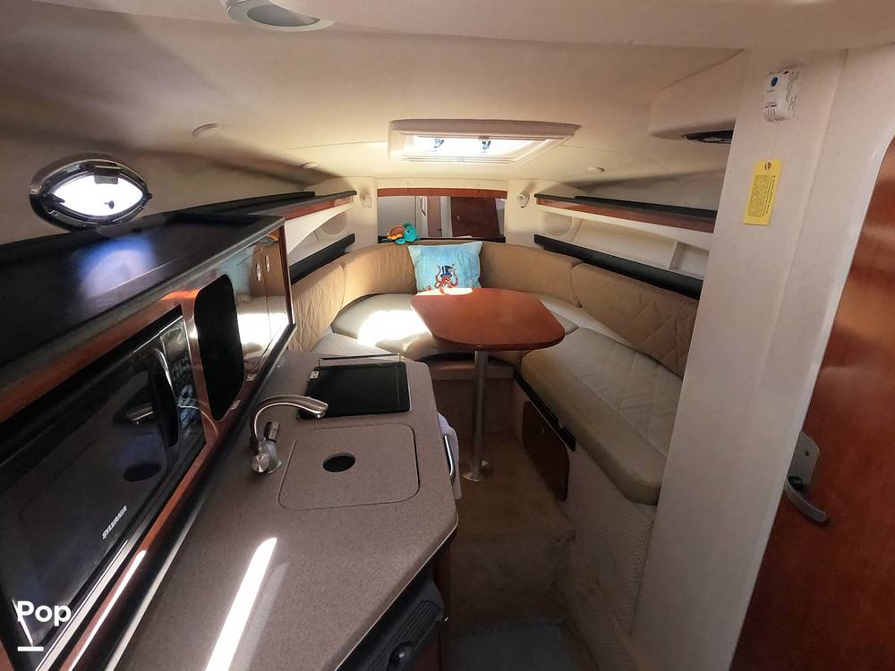 The boat comes with a cockpit wet bar for entertaining, a convertible dinette, and a mid-cabin for additional sleeping space.
