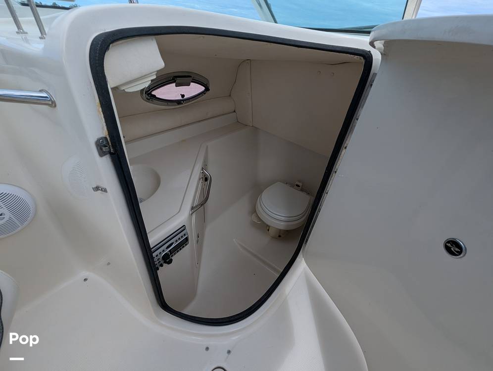 For convenience, there is an enclosed full head and vanity, which is rare to find on a deckboat. In front of the helm, down below, you even sleep up to two comfortably!