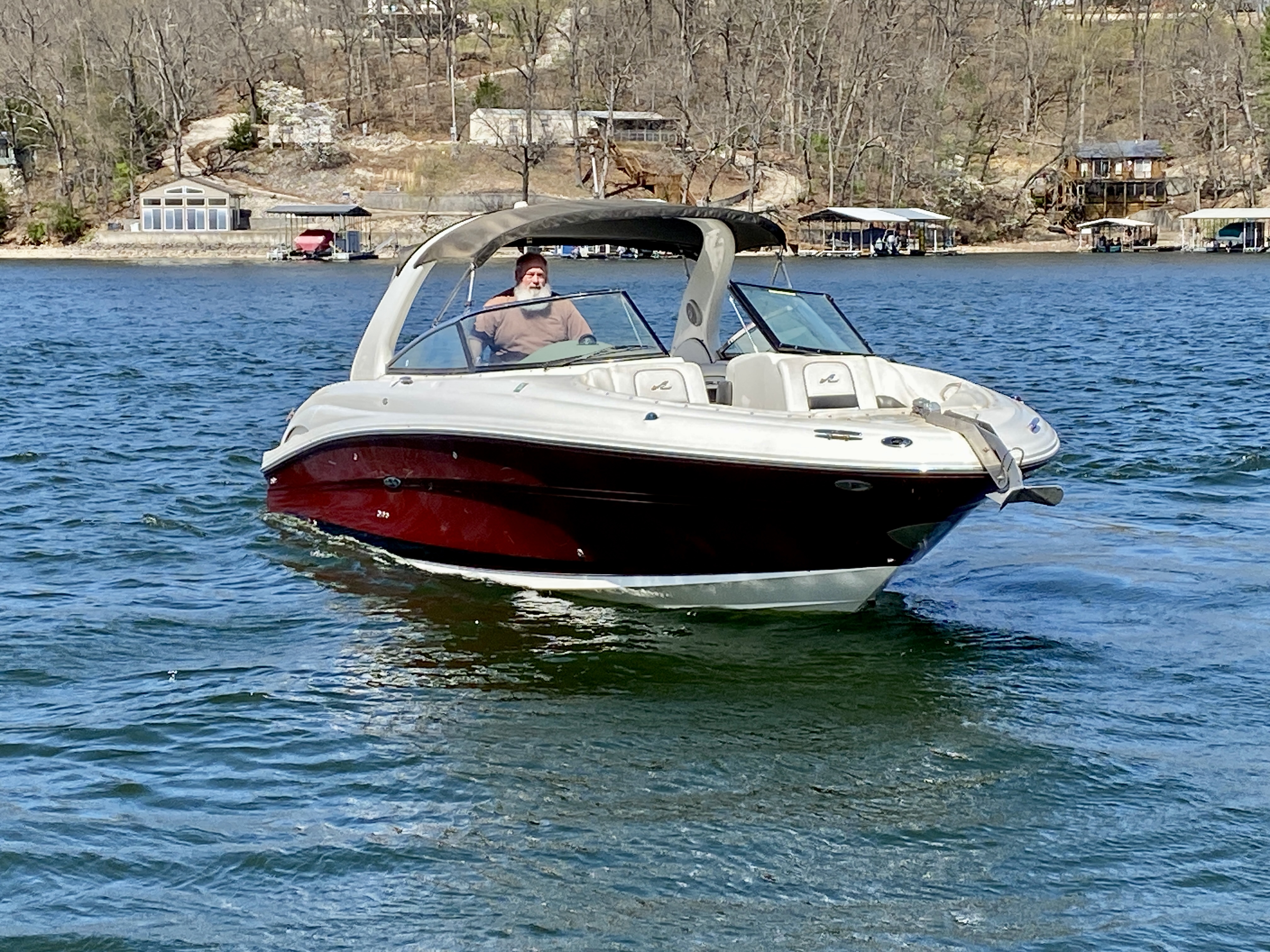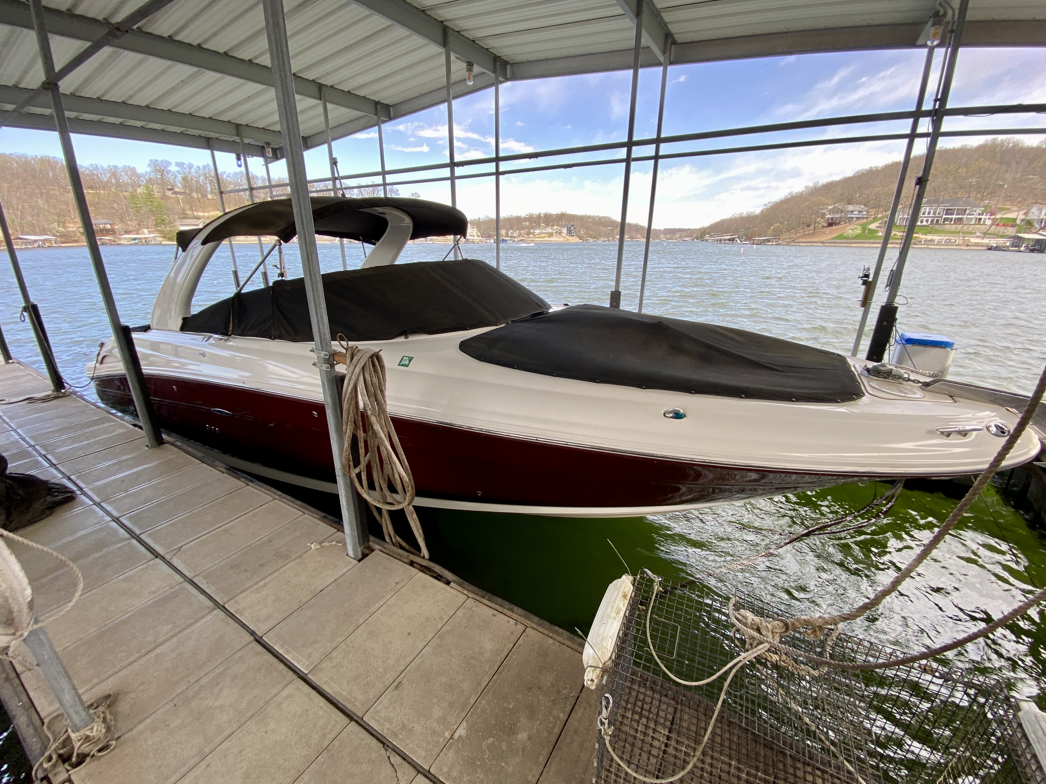 One-owner fresh water boat with LOW HOURS has been stored on a lift under a covered dock its whole life! This twin-engine bowrider is loaded with amenities including pump-out enclosed head, cockpit bar with refrigerator and sink, anchor windlass, extended swimplatform, bow filler cushions and MUCH more! Call today for more details or to schedule viewing.