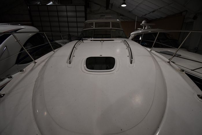 Among several big express cruisers available in recent years, the Sea Ray 390 Sundancer (called the 40 Sundancer in 2006–09) is notable for her sleek styling and distinctive fiberglass hardtop. Sea Ray has been building top-quality family cruisers since the 1980s, and the company has long been known for it’s cutting- edge styling. Built on a deep-V hull with prop pockets and a solid fiberglass bottom, the lavish interior of the 390 Sundancer is a blend of high-gloss cherry-wood cabinets, Ultraleather upholstery, and vinyl wall coverings. A flat-screen TV is built in above the galley counter-top, and by splitting the head into two compartments— toilet to port and shower to starboard—the salon dimensions are those of a slightly larger boat. For privacy, a sliding door separates the master stateroom from the salon. The 390/40’s cockpit is similar to other Sundancer layouts with a U-shaped seating area aft, flip-up helm seat, and Corian-topped wet bar with sink and faucet. The entire cockpit sole can be raised on hydraulic rams for access to the engines.