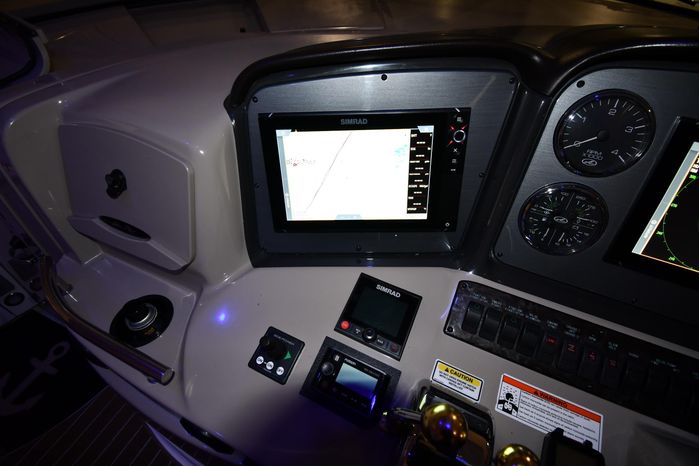 Freshwater / Great Lakes boat since new this vessel features Twin Cummins QSB5.9 380 HO Diesel Engines with only 634 original hours (Note Mercury SmartCraft Display). Notable features include but are not limited to the following: Air-Conditioning & Heat (2-Units w/Cockpit AC/Heat), Head (Vacuflush) w/Vanity/Sink/Stall-Shower, Windlass Anchor w/Forward Pedal Controls (Note Polished Stainless-Steel Anchor), Bow-Thruster, Onan 9MDK8K Diesel Generator, Upgraded Simrad Electronics Package w/Dual Color / TouchScreen Display's w/Radar/GPS.Chartplotter/Sounder - Simrad Autopilot - Simrad VHF Marine Radio, Fusion Premium Sound System w/AMP/Subwoofer, (Note LCD-Television in Forward Stateroom, Electric Operated Flip-Down LCD-Television in Salon), Cockpit Wet Bar w/Sink/Refrigerator, and MUCH more!