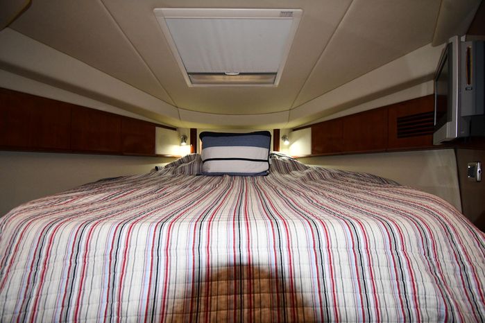 Freshwater / Great Lakes boat since new this vessel features Twin Cummins QSB5.9 380 HO Diesel Engines with only 634 original hours (Note Mercury SmartCraft Display). Notable features include but are not limited to the following: Air-Conditioning & Heat (2-Units w/Cockpit AC/Heat), Head (Vacuflush) w/Vanity/Sink/Stall-Shower, Windlass Anchor w/Forward Pedal Controls (Note Polished Stainless-Steel Anchor), Bow-Thruster, Onan 9MDK8K Diesel Generator, Upgraded Simrad Electronics Package w/Dual Color / TouchScreen Display's w/Radar/GPS.Chartplotter/Sounder - Simrad Autopilot - Simrad VHF Marine Radio, Fusion Premium Sound System w/AMP/Subwoofer, (Note LCD-Television in Forward Stateroom, Electric Operated Flip-Down LCD-Television in Salon), Cockpit Wet Bar w/Sink/Refrigerator, and MUCH more!