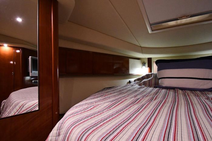 Freshwater / Great Lakes boat since new this vessel features Twin Cummins QSB5.9 380 HO Diesel Engines with only 634 original hours (Note Mercury SmartCraft Display). Notable features include but are not limited to the following: Air-Conditioning & Heat (2-Units w/Cockpit AC/Heat), Head (Vacuflush) w/Vanity/Sink/Stall-Shower, Windlass Anchor w/Forward Pedal Controls (Note Polished Stainless-Steel Anchor), Bow-Thruster, Onan 9MDK8K Diesel Generator, Upgraded Simrad Electronics Package w/Dual Color / TouchScreen Display's w/Radar/GPS.Chartplotter/Sounder - Simrad Autopilot - Simrad VHF Marine Radio, Fusion Premium Sound System w/AMP/Subwoofer, (Note LCD-Television in Forward Stateroom, Electric Operated Flip-Down LCD-Television in Salon), Cockpit Wet Bar w/Sink/Refrigerator, and MUCH more!