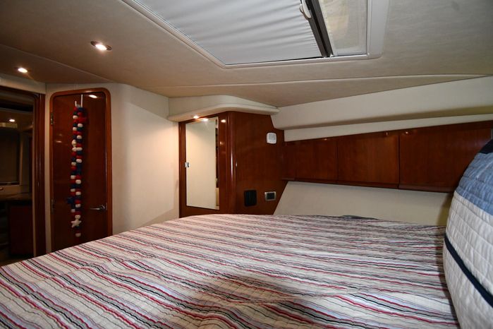 Freshwater / Great Lakes boat since new this vessel features Twin Cummins QSB5.9 380 HO Diesel Engines with only 634 original hours (Note Mercury SmartCraft Display). Notable features include but are not limited to the following: Air-Conditioning & Heat (2-Units w/Cockpit AC/Heat), Head (Vacuflush) w/Vanity/Sink/Stall-Shower, Windlass Anchor w/Forward Pedal Controls (Note Polished Stainless-Steel Anchor), Bow-Thruster, Onan 9MDK8K Diesel Generator, Upgraded Simrad Electronics Package w/Dual Color / TouchScreen Display's w/Radar/GPS.Chartplotter/Sounder - Simrad Autopilot - Simrad VHF Marine Radio, Fusion Premium Sound System w/AMP/Subwoofer, (Note LCD-Television in Forward Stateroom, Electric Operated Flip-Down LCD-Television in Salon), Cockpit Wet Bar w/Sink/Refrigerator, and MUCH more!
