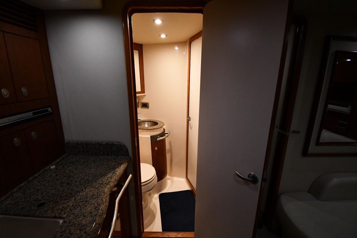 Freshwater / Great Lakes boat since new this vessel features Twin Cummins QSB5.9 380 HO Diesel Engines with only 634 original hours (Note Mercury SmartCraft Display). Notable features include but are not limited to the following: Air-Conditioning & Heat (2-Units w/Cockpit AC/Heat), Head (Vacuflush) w/Vanity/Sink/Stall-Shower, Windlass Anchor w/Forward Pedal Controls (Note Polished Stainless-Steel Anchor), Bow-Thruster, Onan 9MDK8K Diesel Generator, Upgraded Simrad Electronics Package w/Dual Color / TouchScreen Display's w/Radar/GPS.Chartplotter/Sounder - Simrad Autopilot - Simrad VHF Marine Radio, Fusion Premium Sound System w/AMP/Subwoofer, (Note LCD-Television in Forward Stateroom, Electric Operated Flip-Down LCD-Television in Salon), Cockpit Wet Bar w/Sink/Refrigerator, and MUCH more!