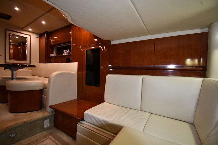 Freshwater / Great Lakes boat since new this vessel features Twin Cummins QSB5.9 380 HO Diesel Engines with only 634 original hours (Note Mercury SmartCraft Display). Notable features include but are not limited to the following: Air-Conditioning & Heat (2-Units w/Cockpit AC/Heat), Head (Vacuflush) w/Vanity/Sink/Stall-Shower, Windlass Anchor w/Forward Pedal Controls (Note Polished Stainless-Steel Anchor), Bow-Thruster, Onan 9MDK8K Diesel Generator, Upgraded Simrad Electronics Package w/Dual Color / TouchScreen Display's w/Radar/GPS.Chartplotter/Sounder - Simrad Autopilot - Simrad VHF Marine Radio, Fusion Premium Sound System w/AMP/Subwoofer, (Note LCD-Television in Forward Stateroom, Electric Operated Flip-Down LCD-Television in Salon), Cockpit Wet Bar w/Sink/Refrigerator, and MUCH more!