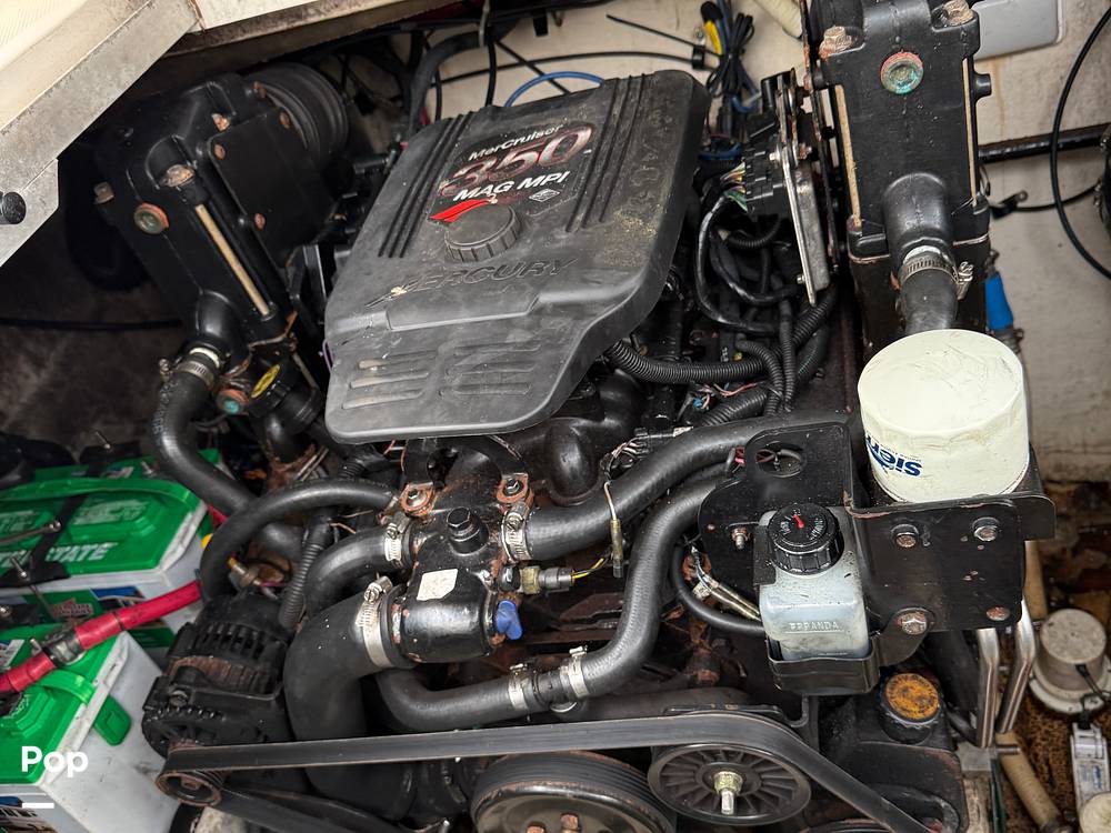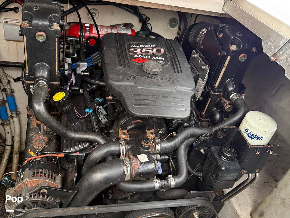 Her seating cockpit is open and very well laid out. She has a wide swim platform with walk-through access door to cockpit. This boat has full width aft seating, a built-in fish box, rod holders, cockpit shower, and a battery switch in the easy access panel with breakers and a panel for accessories.