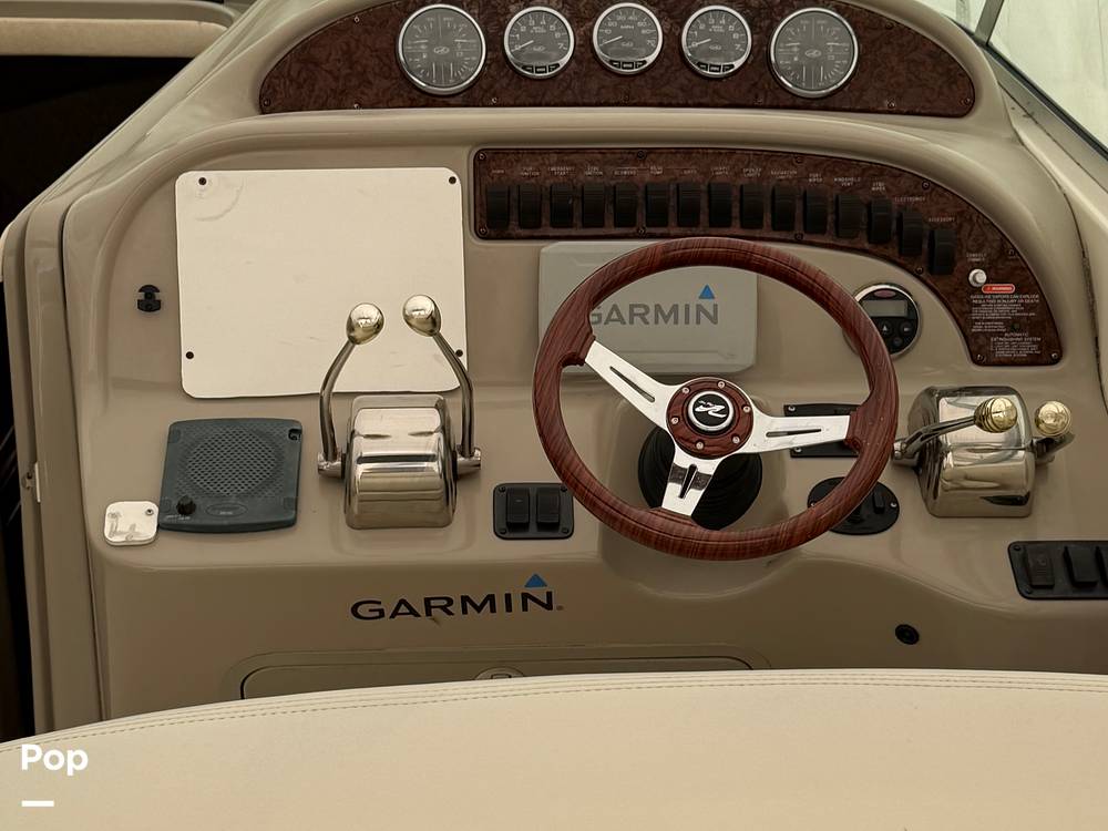 The helm is nicely laid out and attractive with wood steering wheel, wood grain trimmed gauges, and integrated dash.The Captain's seat is heavy duty with adjustable bolsters for standing or sitting while in command of the vessel. A complete array of gauges and rocker switches, Sea Ray Diagnostic center, VHF, compass, windlass control, among other instruments are all at your fingertips. Visibility from the Captain's vantage point is excellent with a view of the bow, cockpit and stern clearly in sight. This vessel has a Raymarine C-80 Radar and also a Lowrance HDS 5 side Scanning transducer.