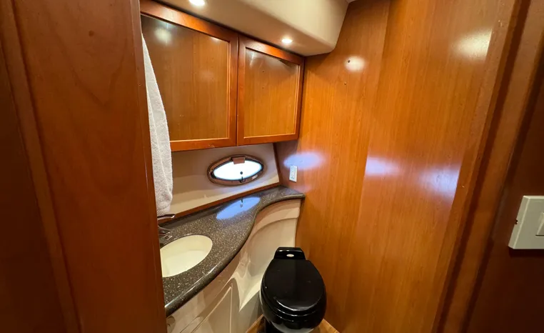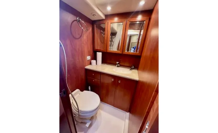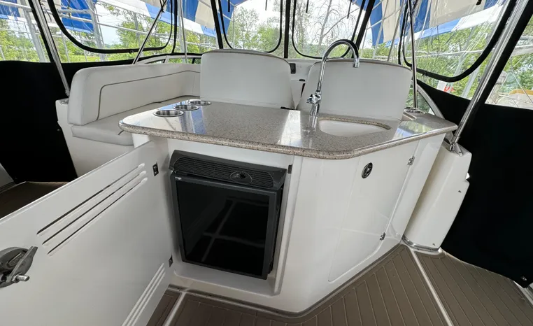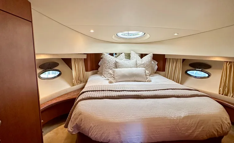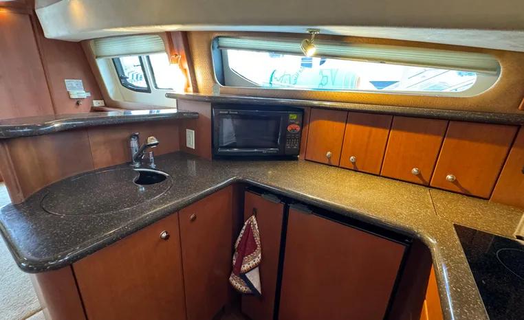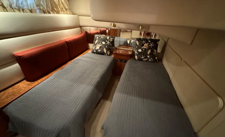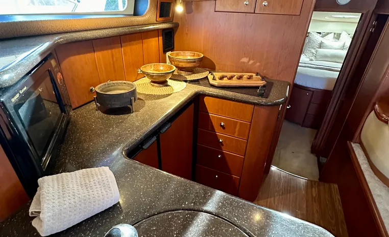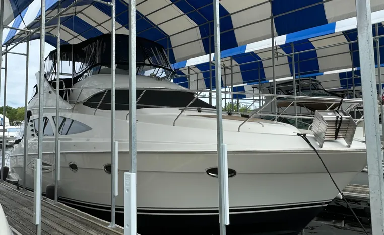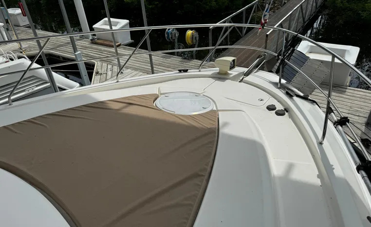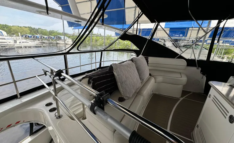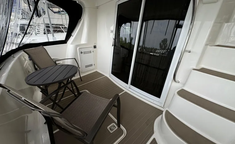 The 43 Sport Bridge boasts one of the largest flybridges of any boat in its class. With its ample seating and wide foredeck, this spacious bridge provides all the room and comfort you need to cruise and entertain in style. Silverton's SideWalk, a unique set of molded steps connecting the bridge to the foredeck, makes access between both safe and convenient whether you're underway, anchored or handling lines. Inside, you'll discover two private staterooms and two full heads complemented by a plush salon finished in fine cherry wood and a full-amenity galley. A wealth of additional standard features like solid Corian countertops, designer fabrics and a 20" flat screen TV remind you that you're aboard a Silverton.