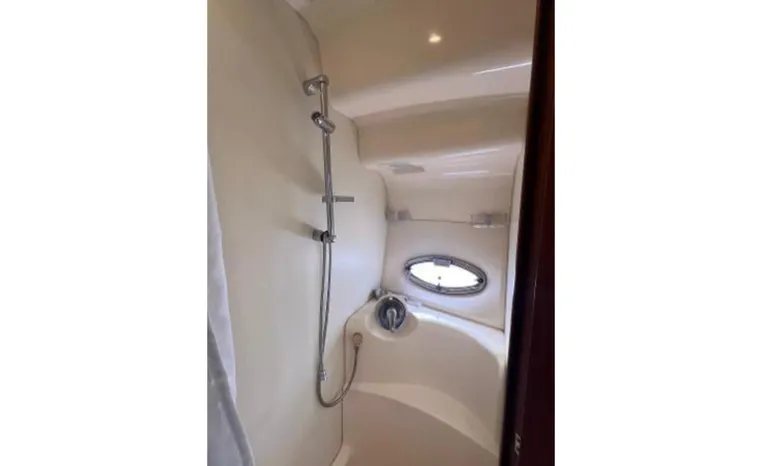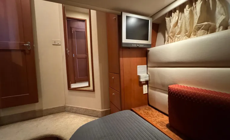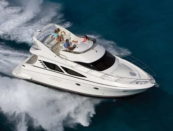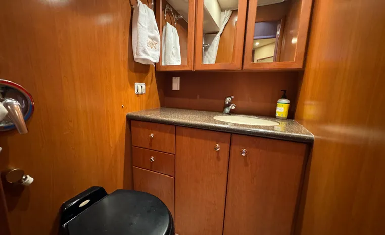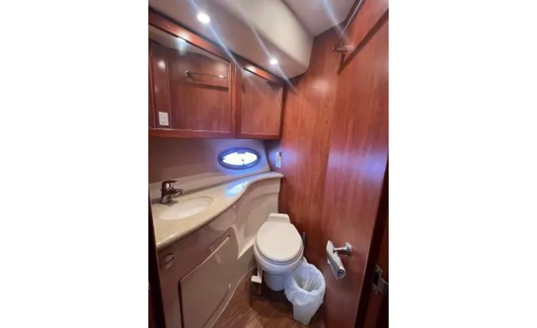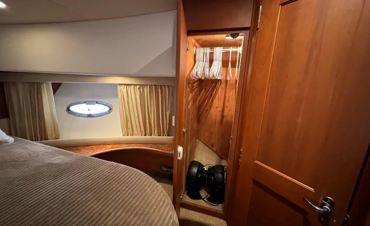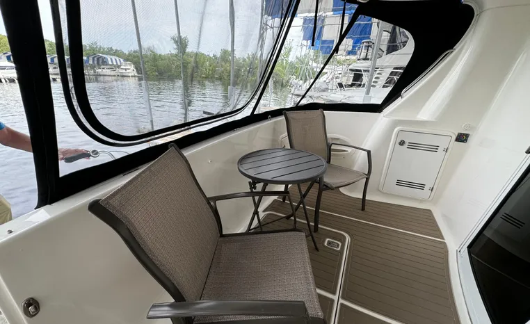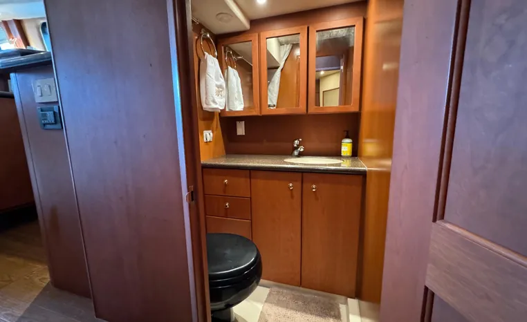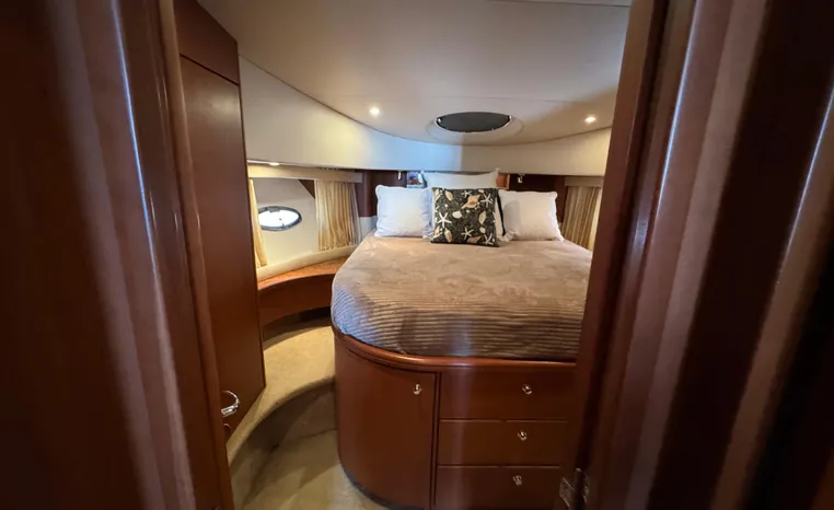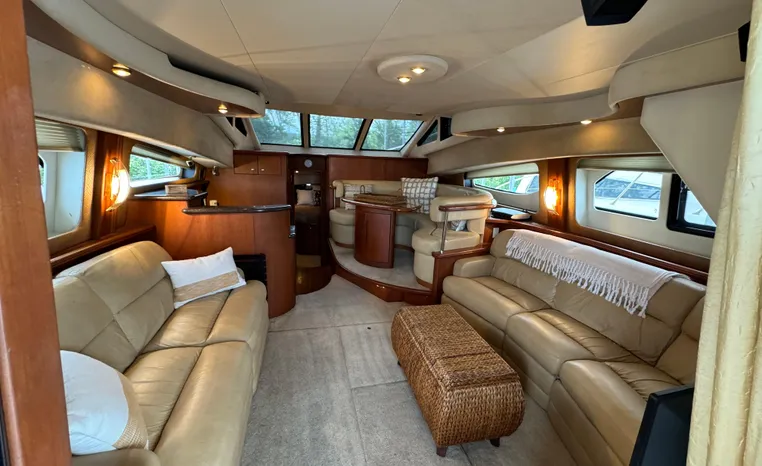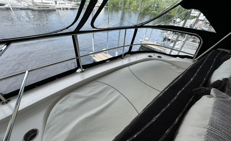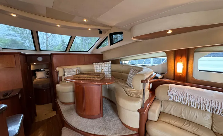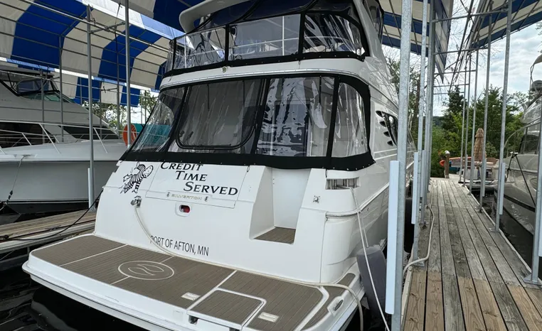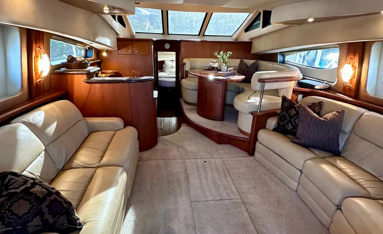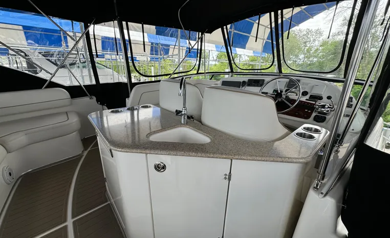 The 43 Sport Bridge boasts one of the largest flybridges of any boat in its class. With its ample seating and wide foredeck, this spacious bridge provides all the room and comfort you need to cruise and entertain in style. Silverton's SideWalk, a unique set of molded steps connecting the bridge to the foredeck, makes access between both safe and convenient whether you're underway, anchored or handling lines. Inside, you'll discover two private staterooms and two full heads complemented by a plush salon finished in fine cherry wood and a full-amenity galley. A wealth of additional standard features like solid Corian countertops, designer fabrics and a 20" flat screen TV remind you that you're aboard a Silverton.