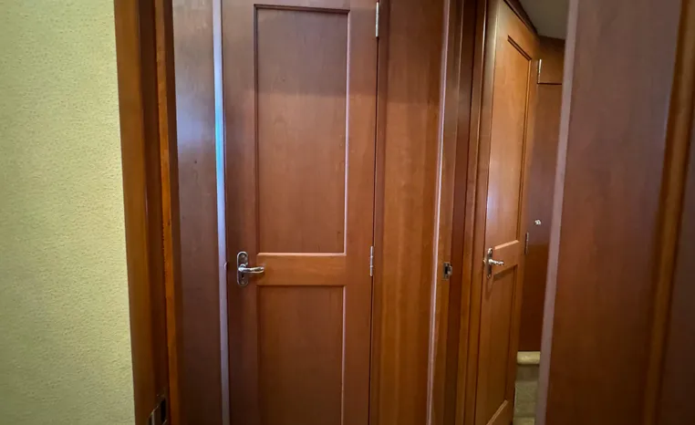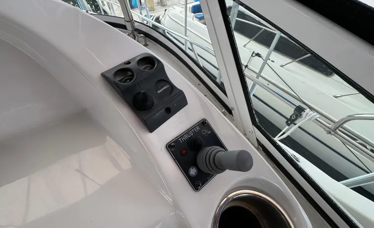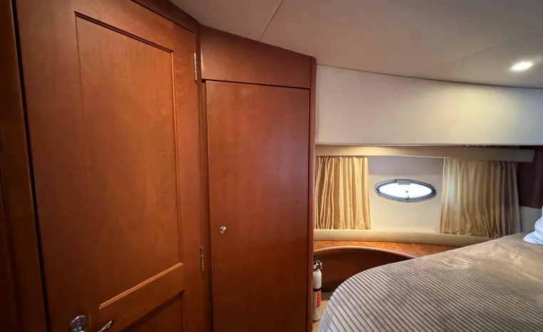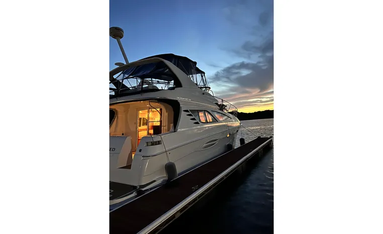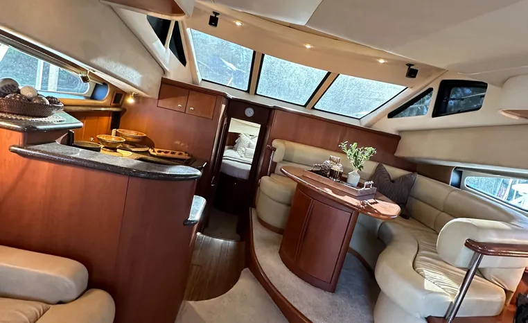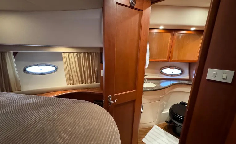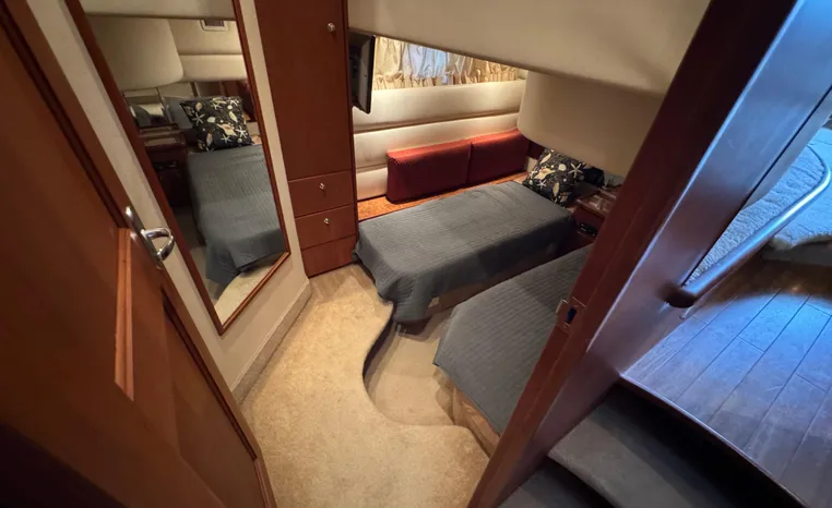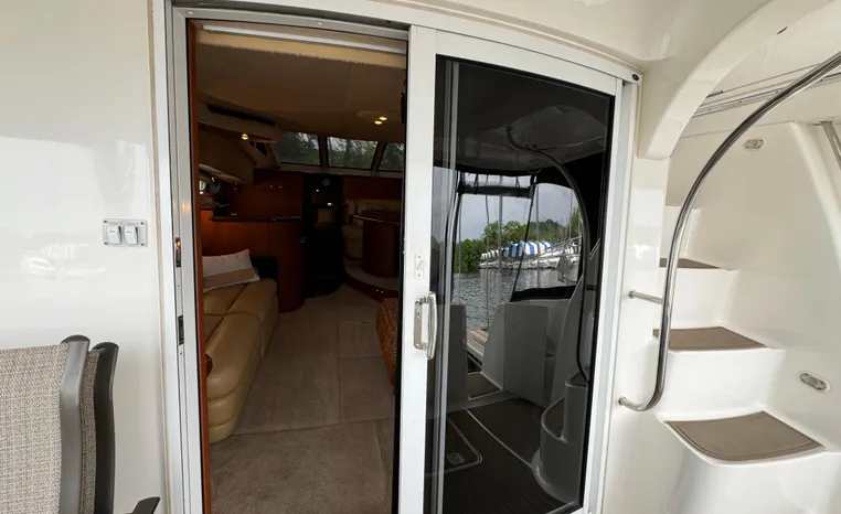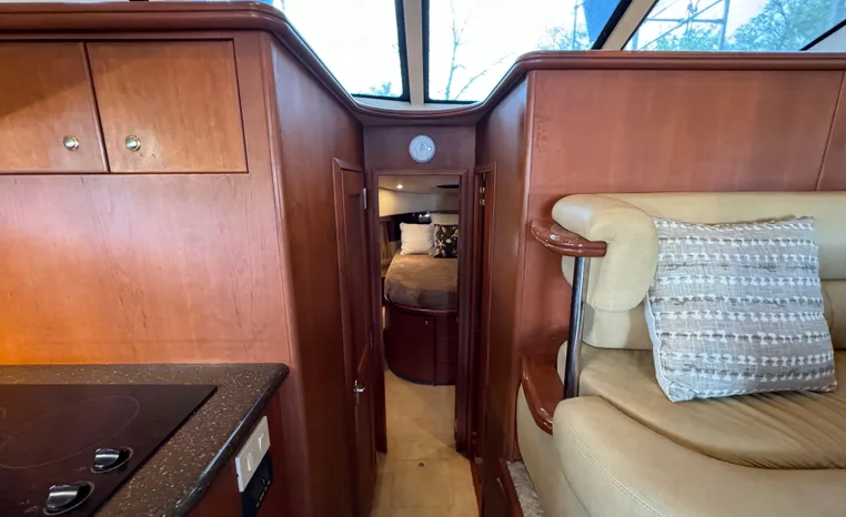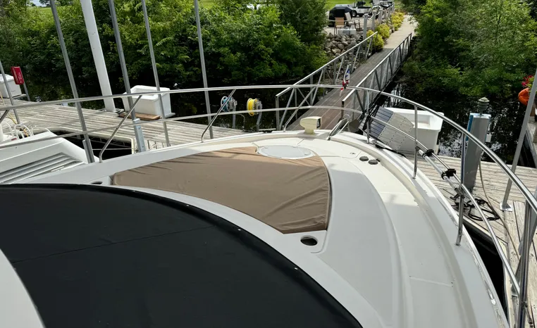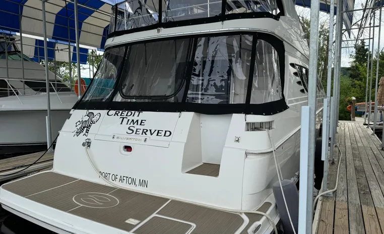 The 43 Sport Bridge boasts one of the largest flybridges of any boat in its class. With its ample seating and wide foredeck, this spacious bridge provides all the room and comfort you need to cruise and entertain in style. Silverton's SideWalk, a unique set of molded steps connecting the bridge to the foredeck, makes access between both safe and convenient whether you're underway, anchored or handling lines. Inside, you'll discover two private staterooms and two full heads complemented by a plush salon finished in fine cherry wood and a full-amenity galley. A wealth of additional standard features like solid Corian countertops, designer fabrics and a 20" flat screen TV remind you that you're aboard a Silverton.