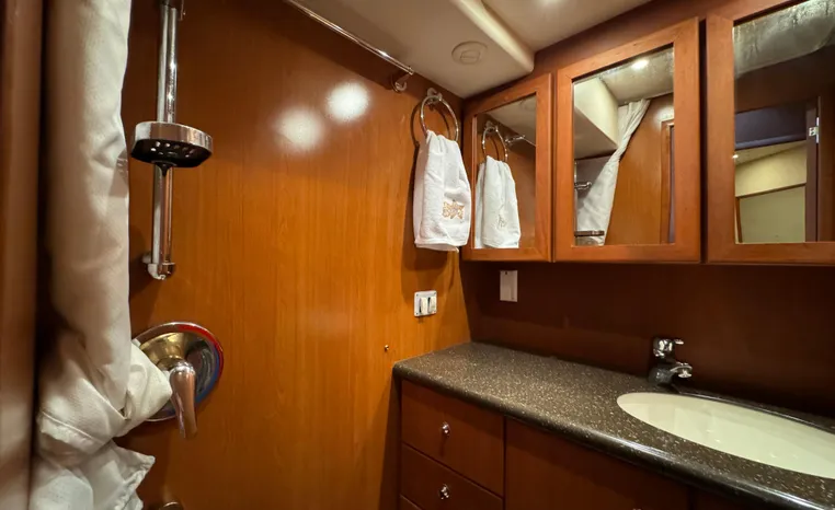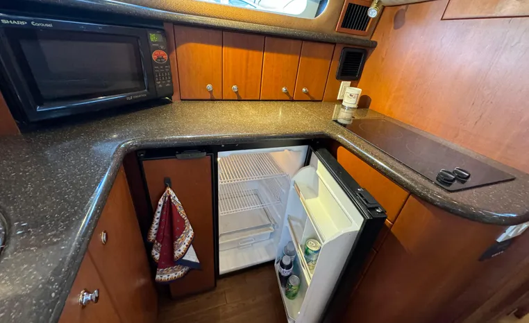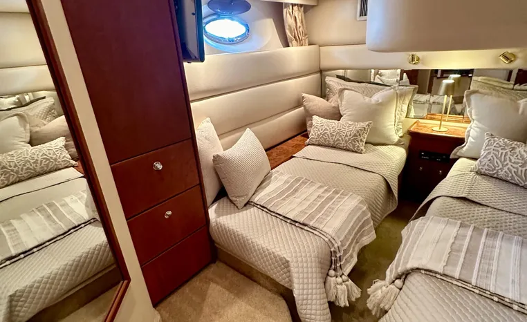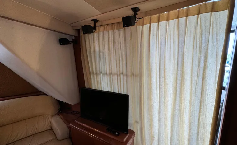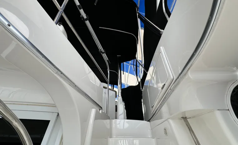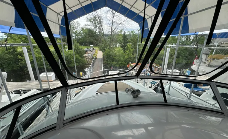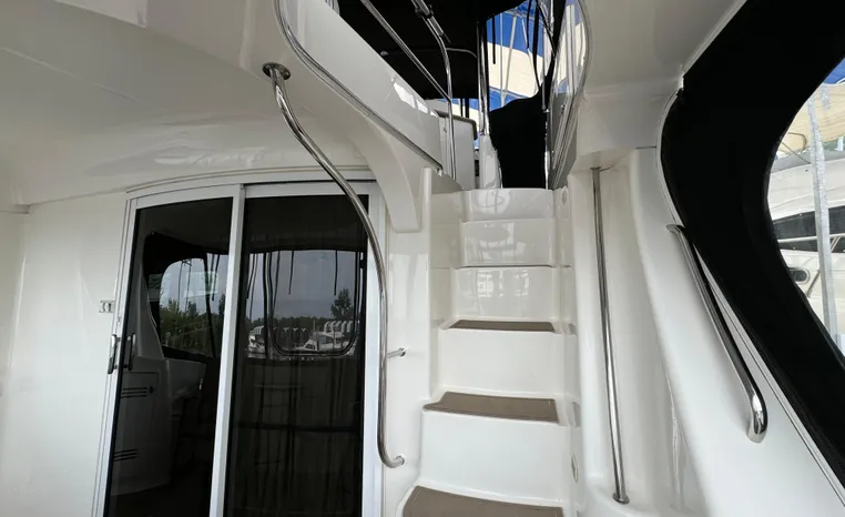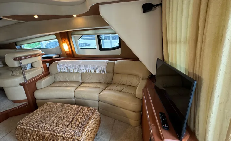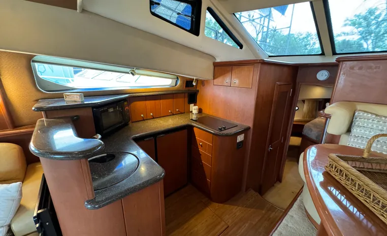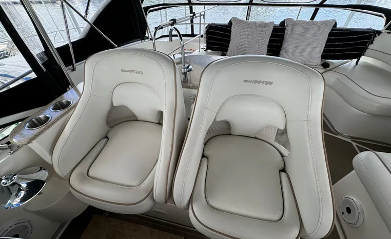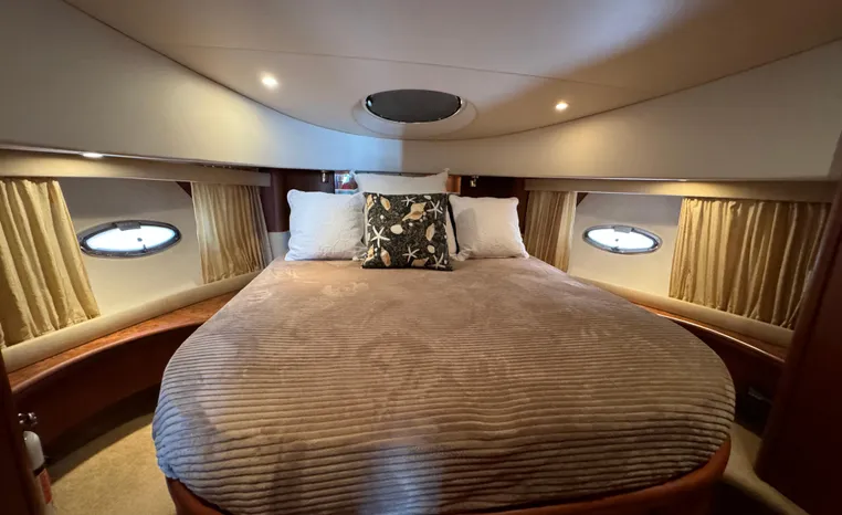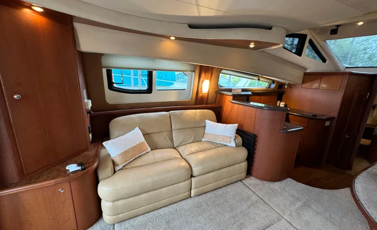 The 43 Sport Bridge boasts one of the largest flybridges of any boat in its class. With its ample seating and wide foredeck, this spacious bridge provides all the room and comfort you need to cruise and entertain in style. Silverton's SideWalk, a unique set of molded steps connecting the bridge to the foredeck, makes access between both safe and convenient whether you're underway, anchored or handling lines. Inside, you'll discover two private staterooms and two full heads complemented by a plush salon finished in fine cherry wood and a full-amenity galley. A wealth of additional standard features like solid Corian countertops, designer fabrics and a 20" flat screen TV remind you that you're aboard a Silverton.