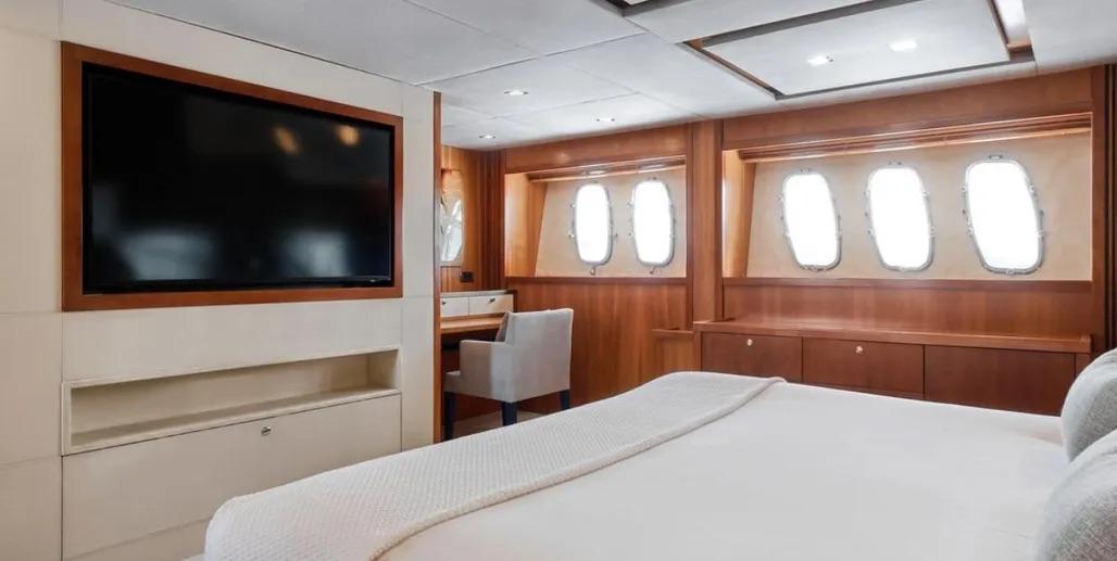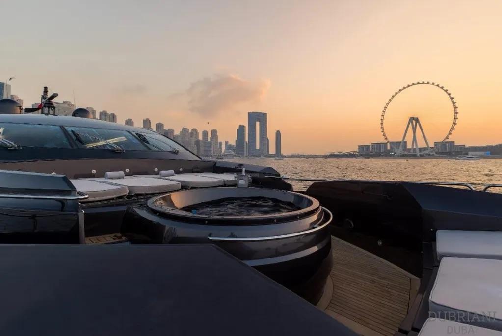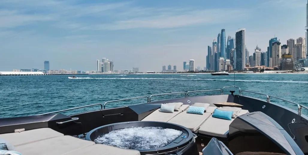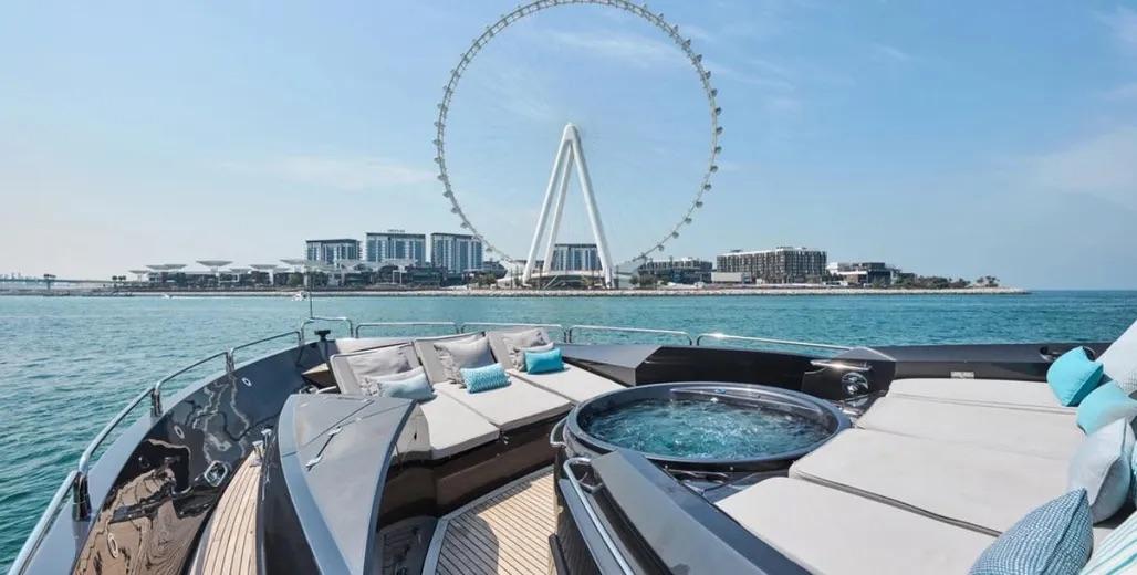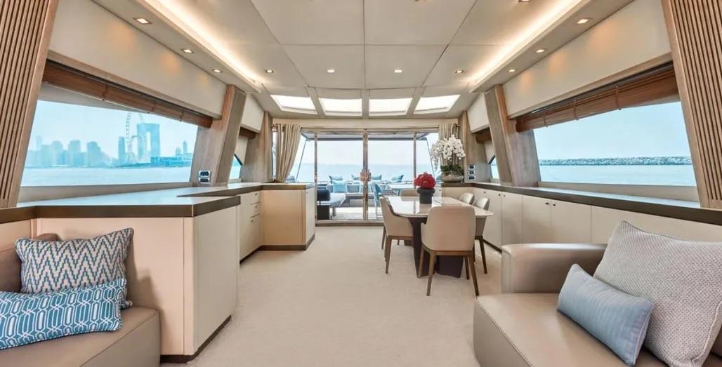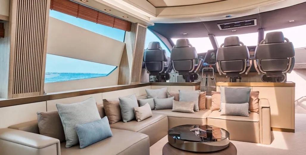 Cockpit life centers on effortless entertaining. The wet bar stands ready for cocktails, while a spa tub up forward invites sunset soaks. Hydraulic systems lower the gangway, open the stern garage for tender launch, and deploy the passerelle, all at your fingertips. Overhead and low-level lighting set the mood as Fusion sound fills the cockpit and CCTV keeps watch.