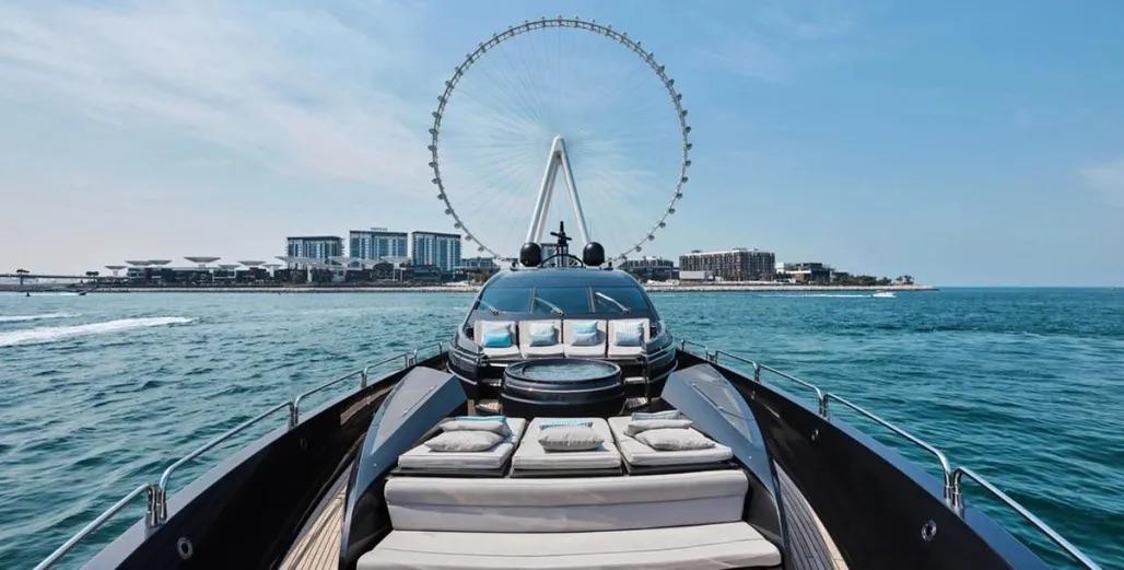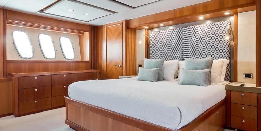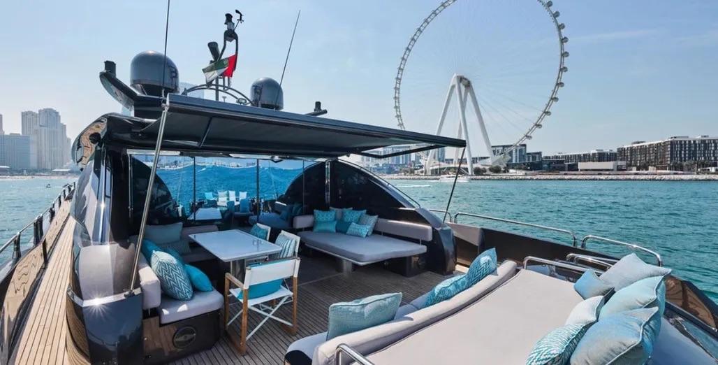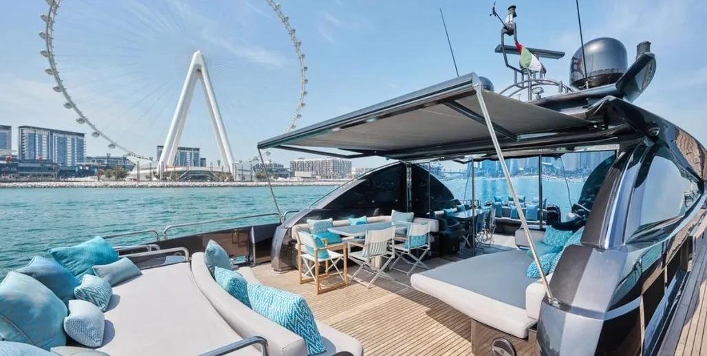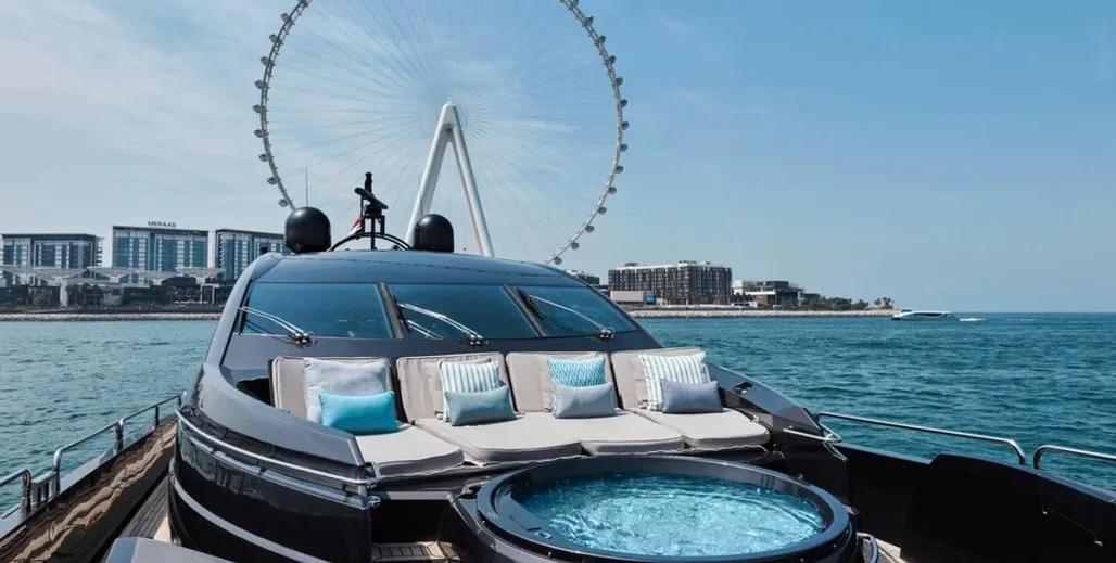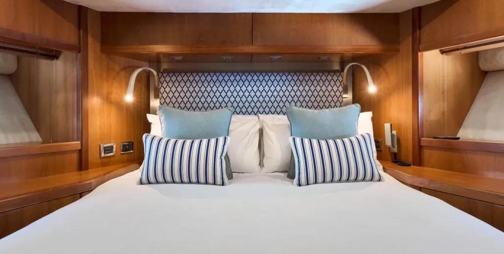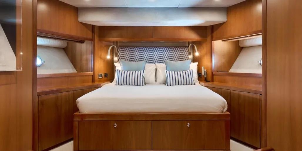Cockpit life centers on effortless entertaining. The wet bar stands ready for cocktails, while a spa tub up forward invites sunset soaks. Hydraulic systems lower the gangway, open the stern garage for tender launch, and deploy the passerelle, all at your fingertips. Overhead and low-level lighting set the mood as Fusion sound fills the cockpit and CCTV keeps watch.