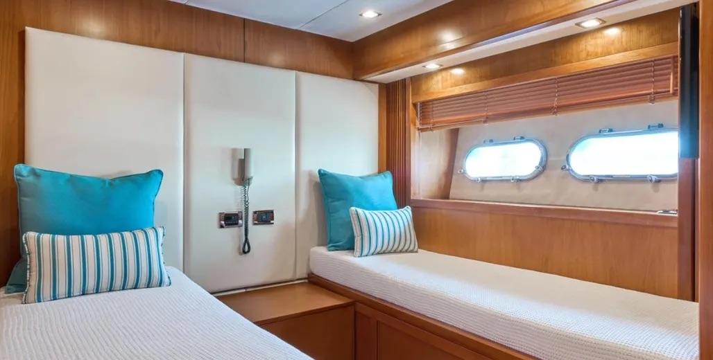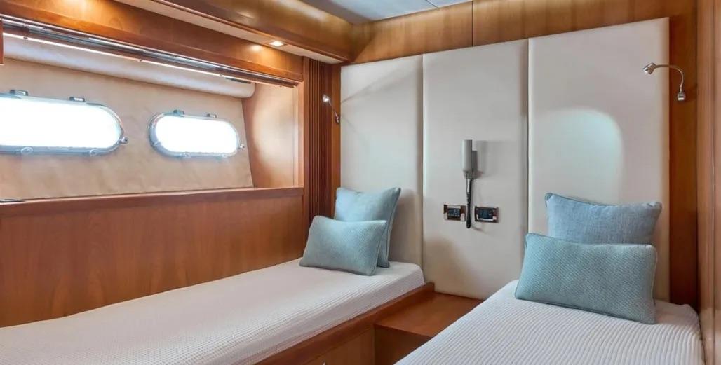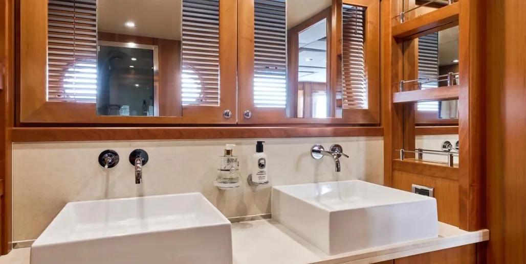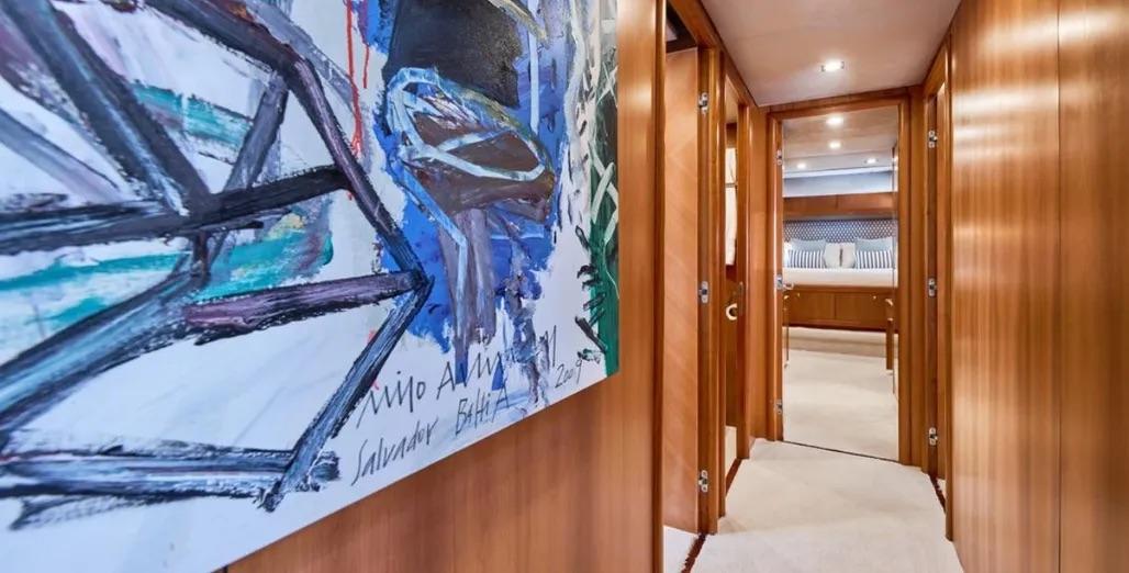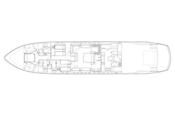 Complete exterior paint and new cockpit cushions & covers • New carpet throughout • Recent antifouling • Deep-V hull • Teak-laid decks and bathing platform • Wet bar with griddle, sink, ice maker & cool chest • Hydraulic gangway & power-operated stern garage door • CCTV stern camera • Fusion CD/radio with four cockpit speakers • Three-zone overhead, low-level & docking lights • Spa tub on foredeck • Stern & bow thrusters • Passerelle • Fresh-/sea-water washdown • 55 kVA Kohler generators (2) • Galley and crew quarters • RINA/USCG build standards