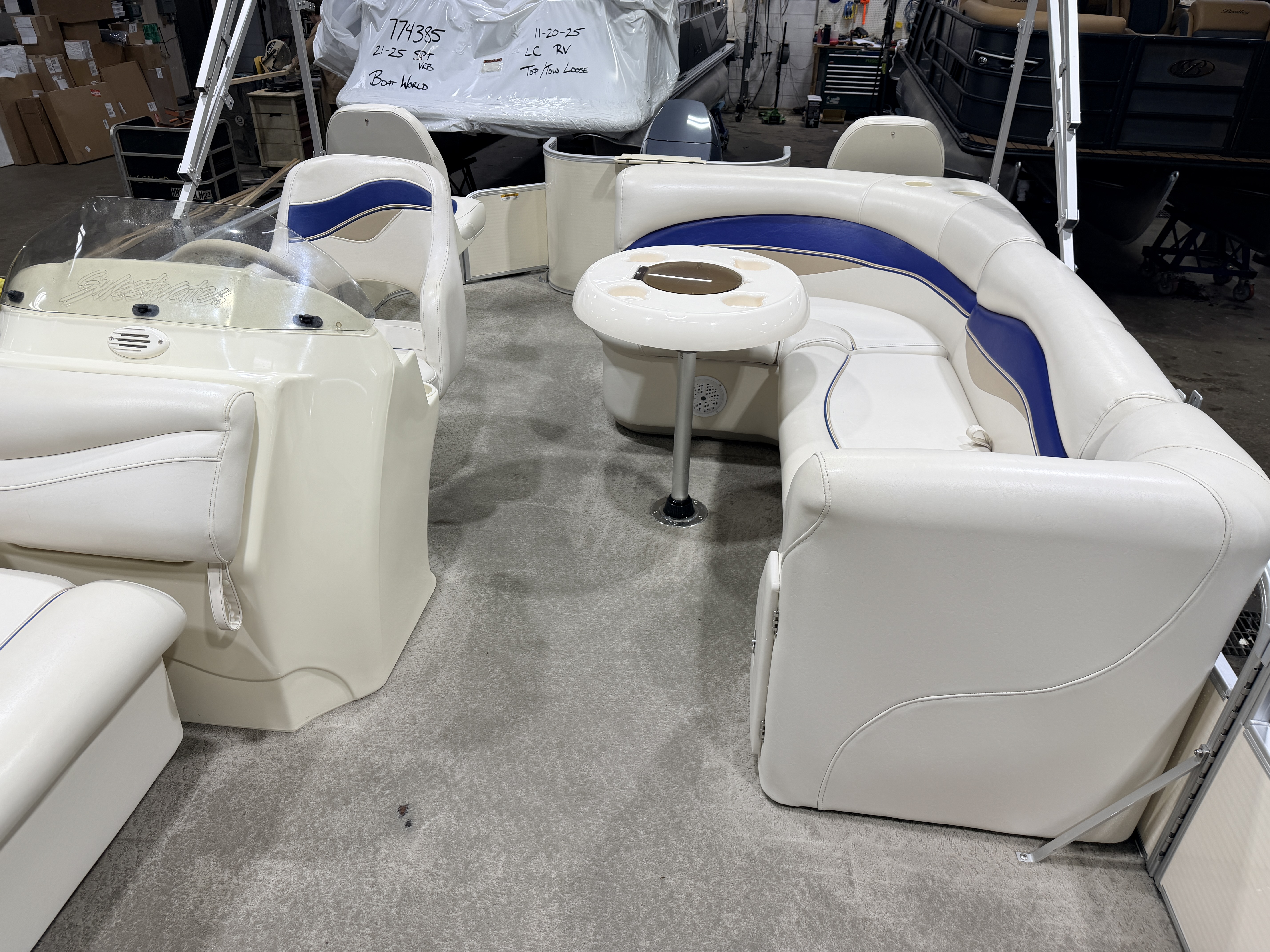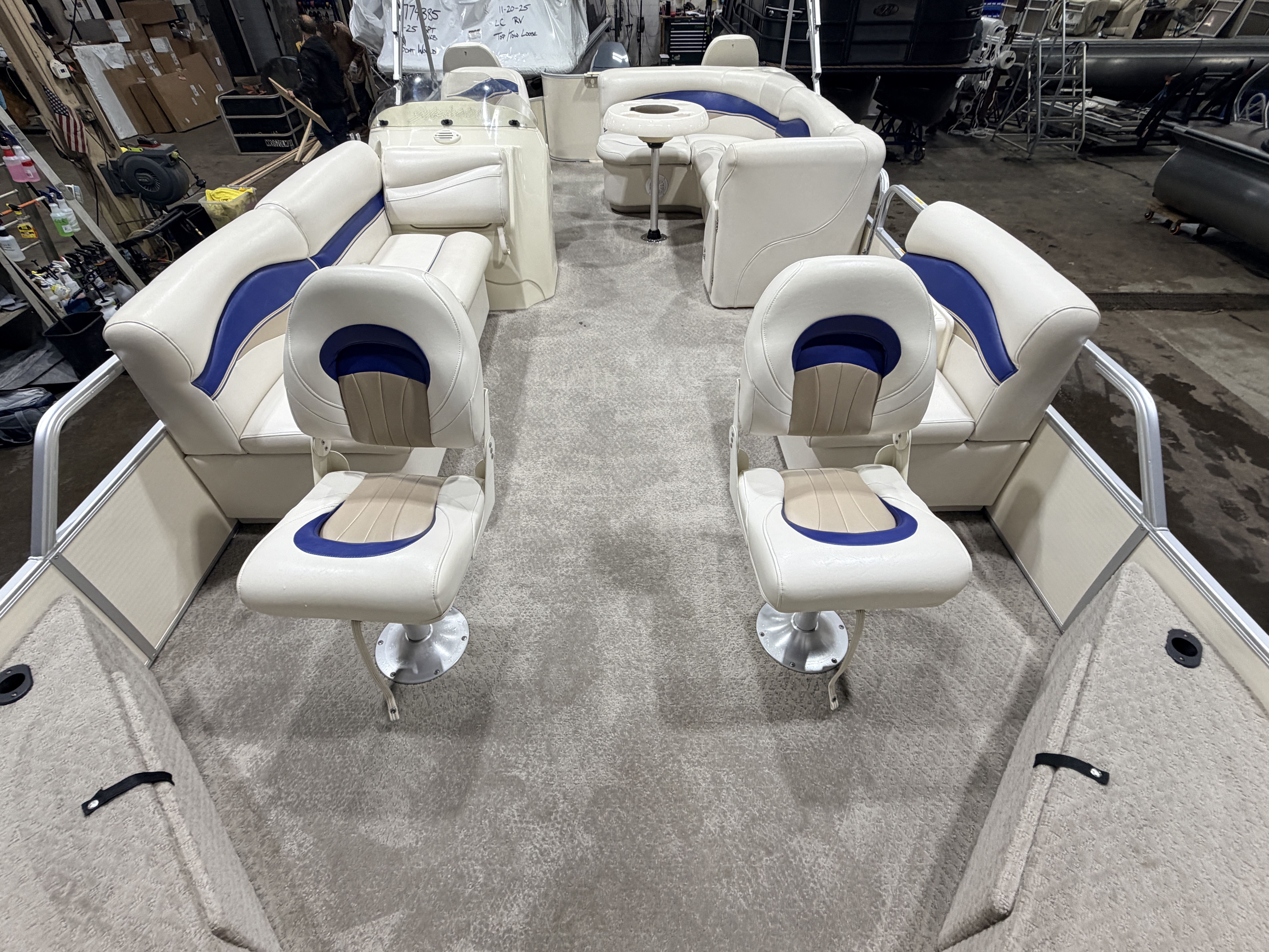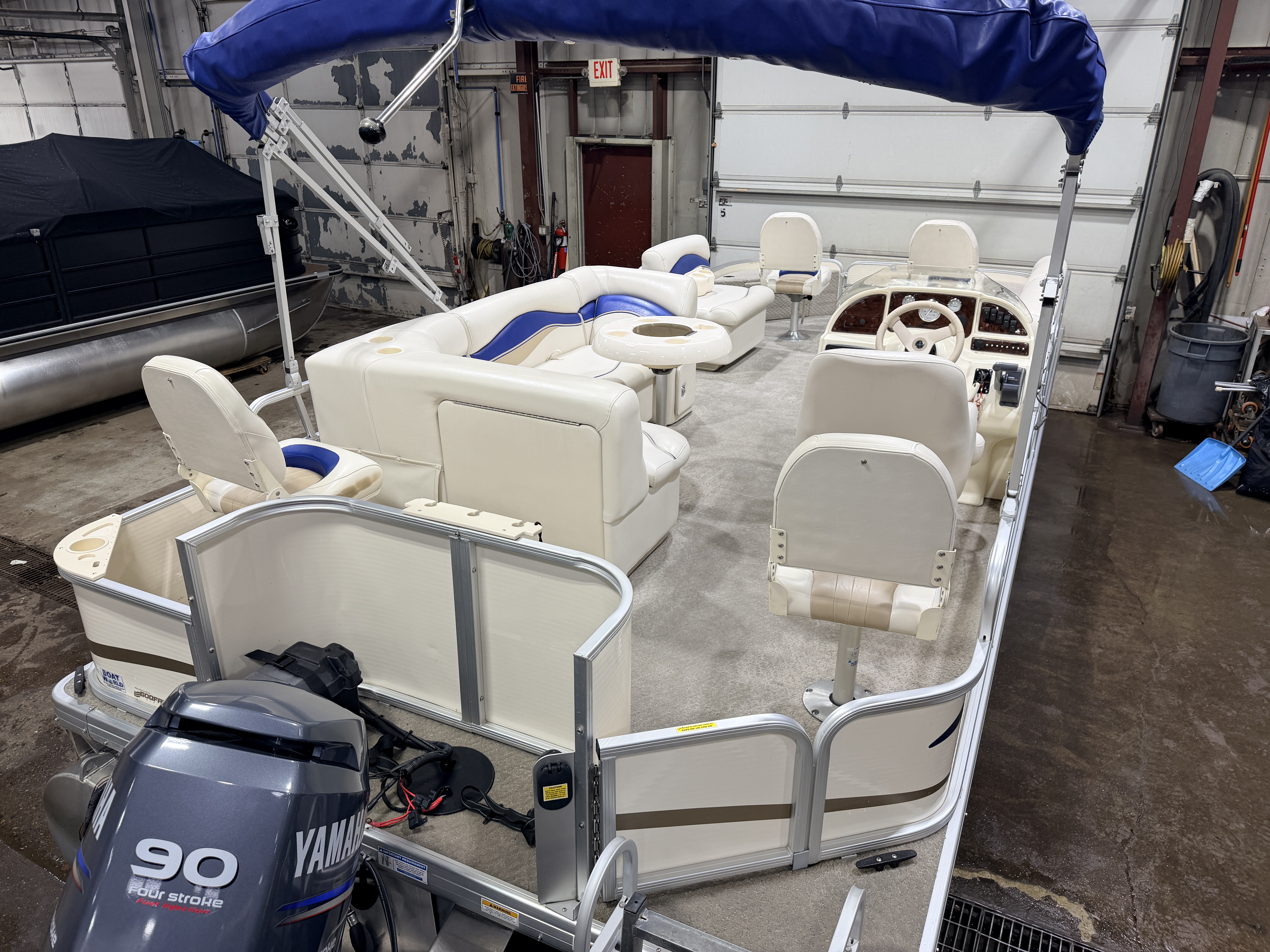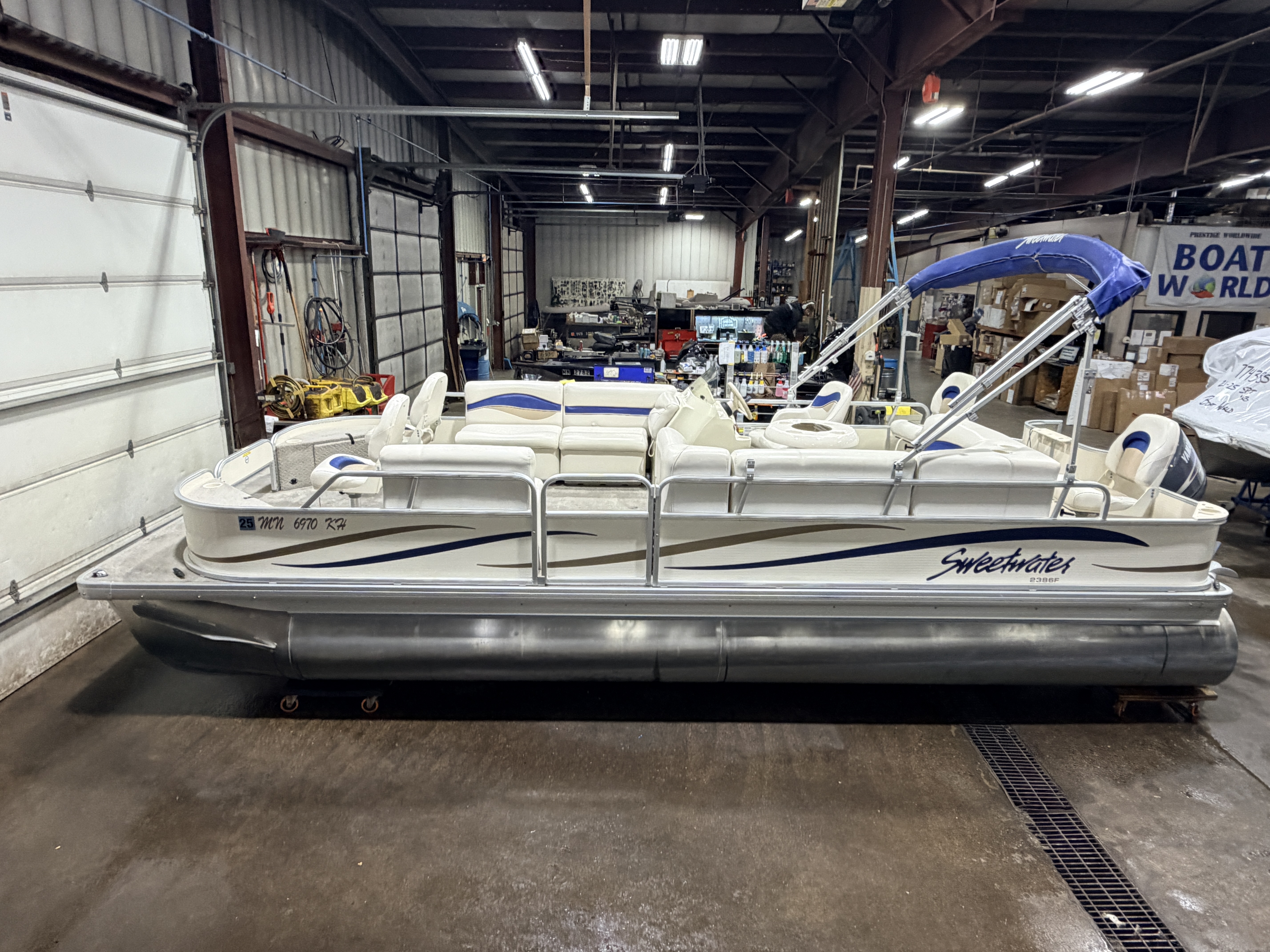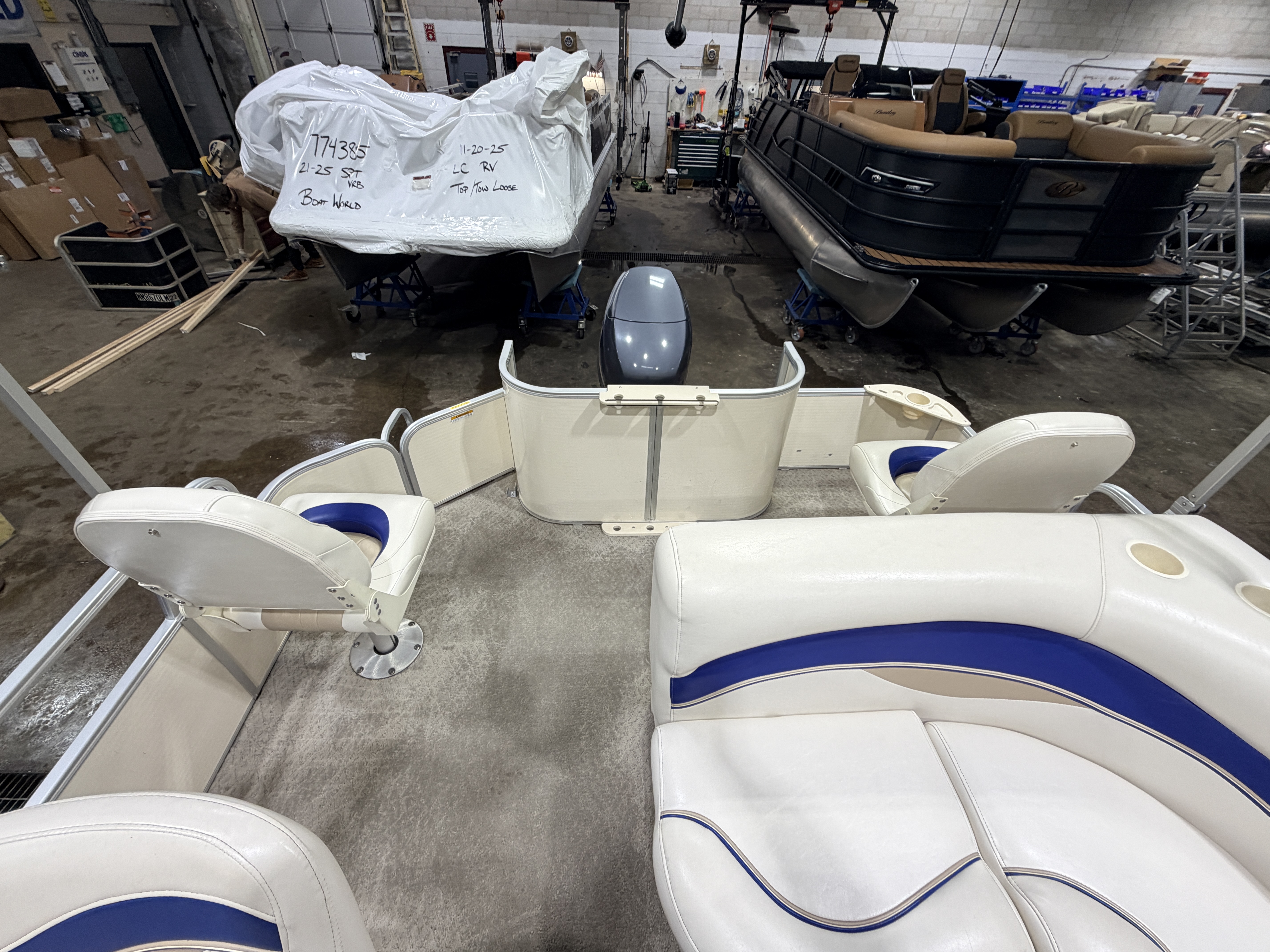 2006 Sweetwater 2386 F Quad Fish Pontoon with 90HP Yamaha Fourstroke EFI Outboard. Interior seating includes 4 fishing seats, an L-shaped couch, 1 lounge style couch, and a bench couch. The captain's chair is a bucket style seat with integrated drink holder. Helm includes a Tachometer, Fuel and Volt gauge, Pyle Bluetooth audio stereo with USB input. Additional features include in-seat storage, bimini top, docking lights, vertical rod storage, dual front consoles with cup holder, rod holder, and storage compartment, a water-tight storage pod in the helm, and table with cooler in the middle.