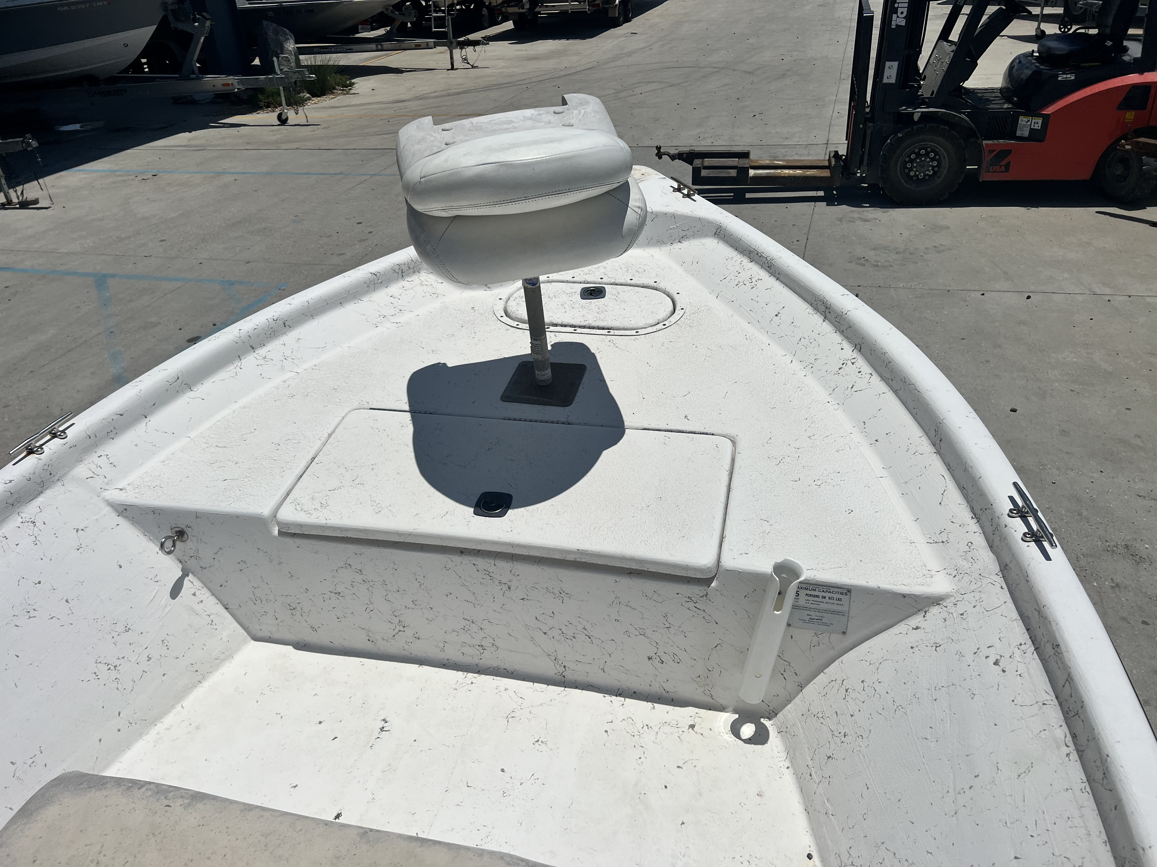 Fiberglass hull, approx. 18′ 4″ long and 7′ 5″ beam, lightweight (~975 lbs dry) and efficient.