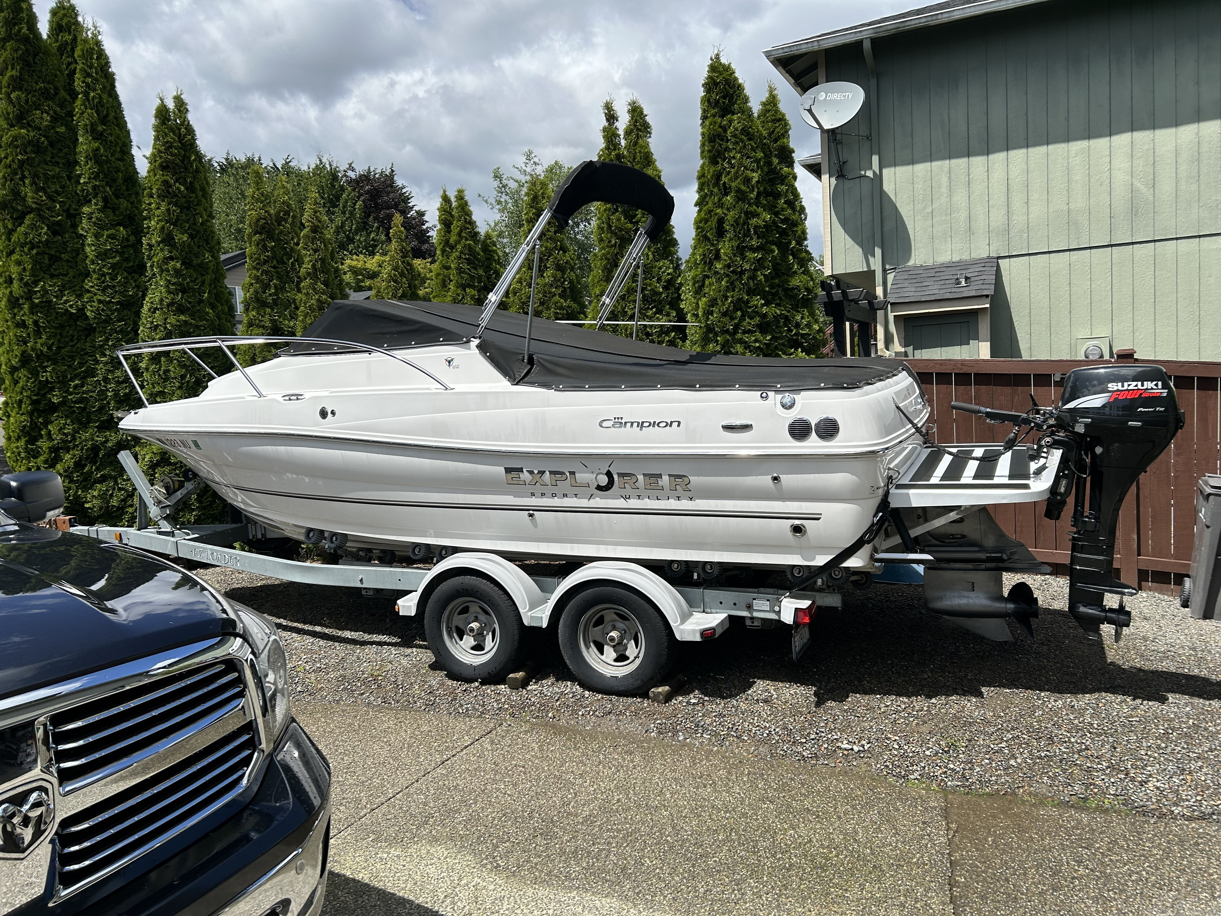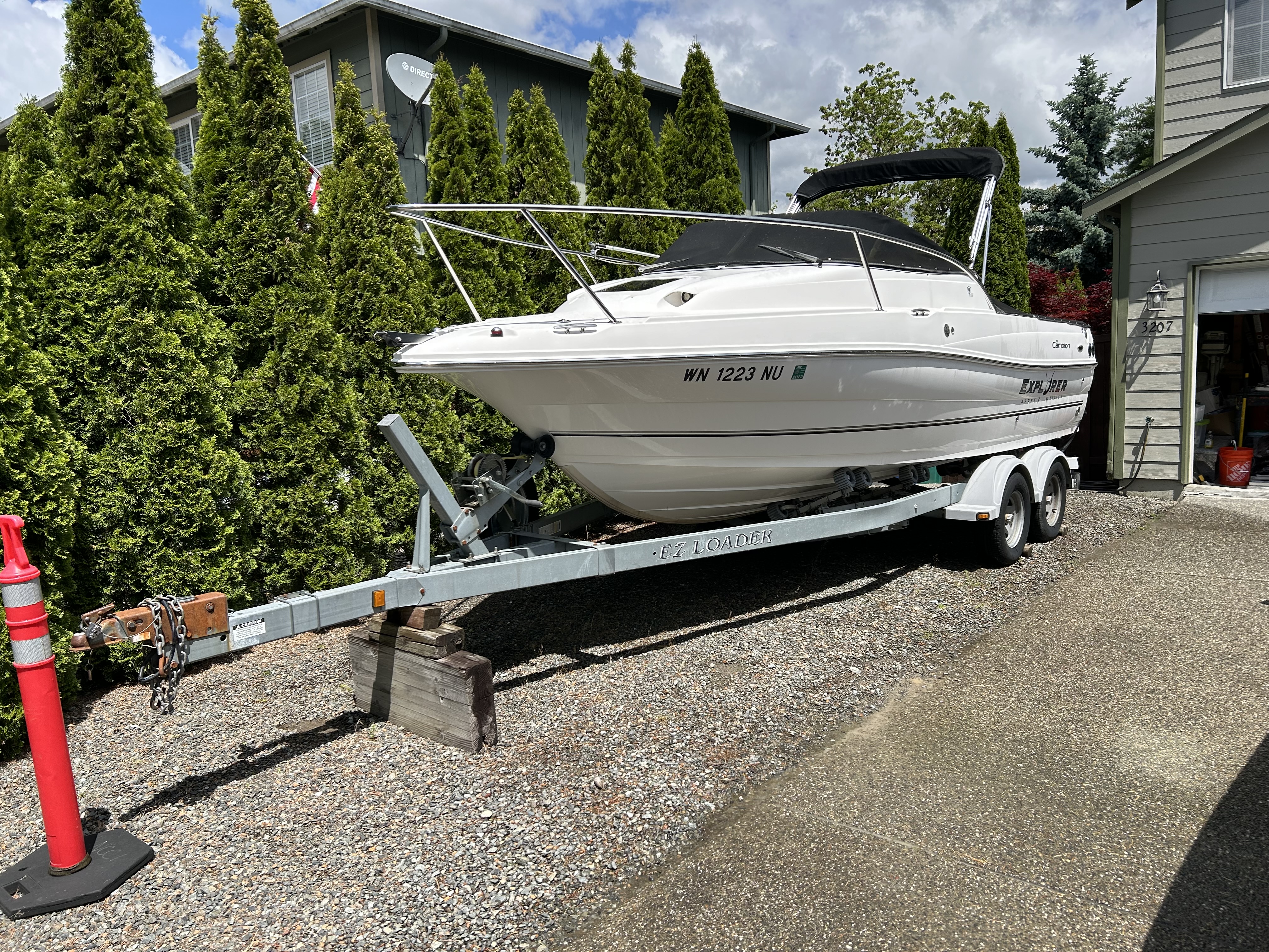She’s a beauty! 21’ cuddy cabin with full canvas and safety equip.and 9.9 4 stroke Suzuki long shaft on swim platform. Nice stereo system and VHF radio/ antenna Well maintained in great condition. Ez loader tandem trailer with new spare tire.