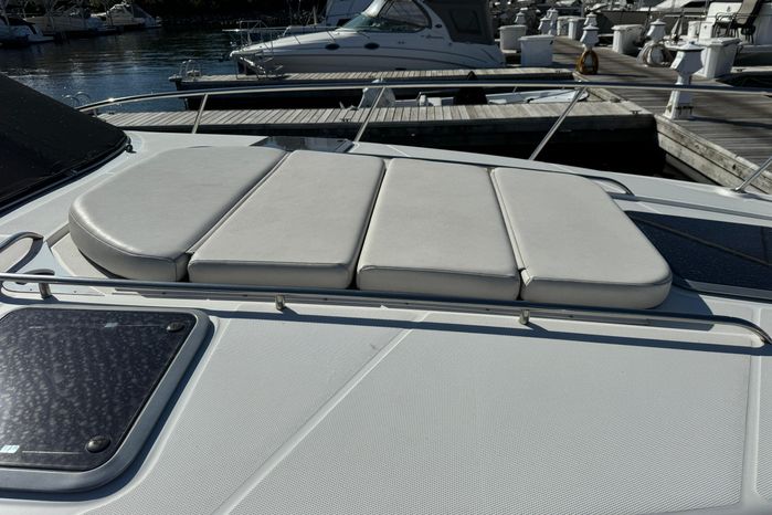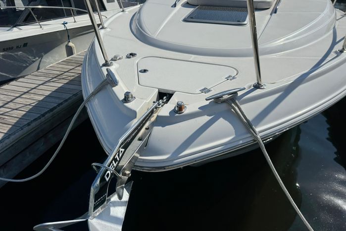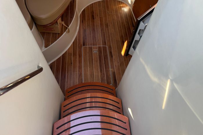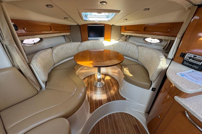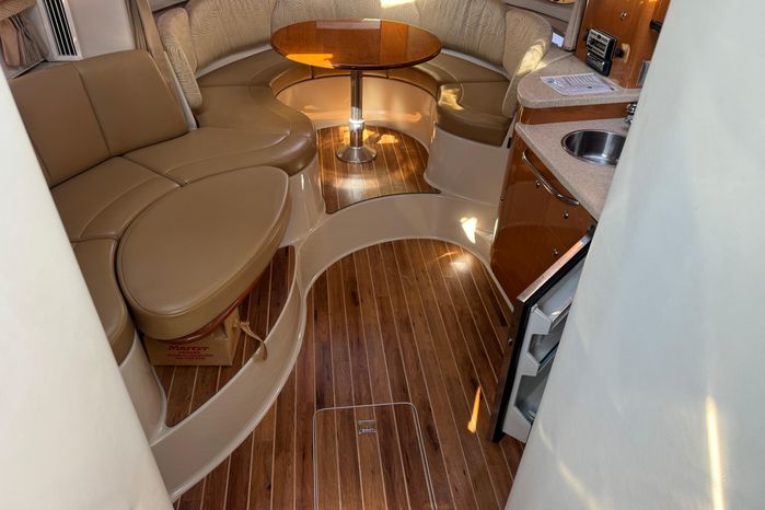 The spacious cockpit features wraparound seating, a wet bar with sink and refrigerator, and a large swim platform — perfect for entertaining family and friends. Down below, the cabin offers luxurious accommodations with a forward berth, mid-cabin lounge that converts to a double, full galley, and an enclosed head with shower. High-end finishes, cherry wood cabinetry, and thoughtful design make this cruiser feel much larger than her size suggests.