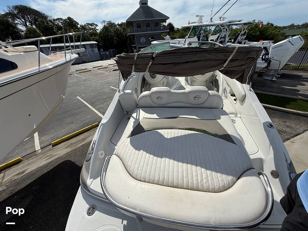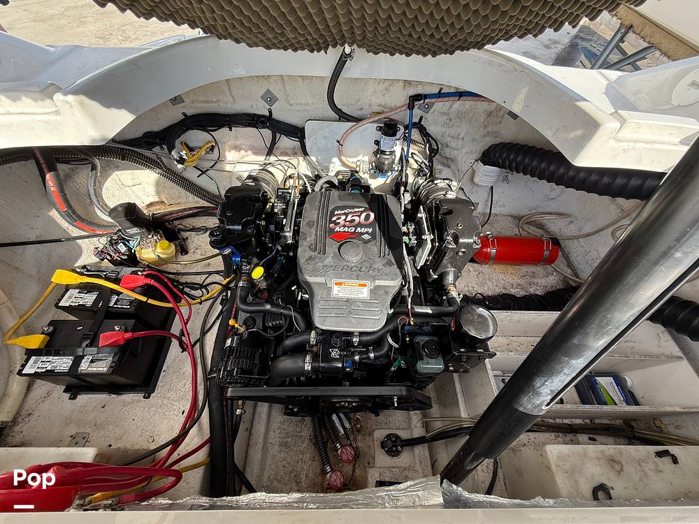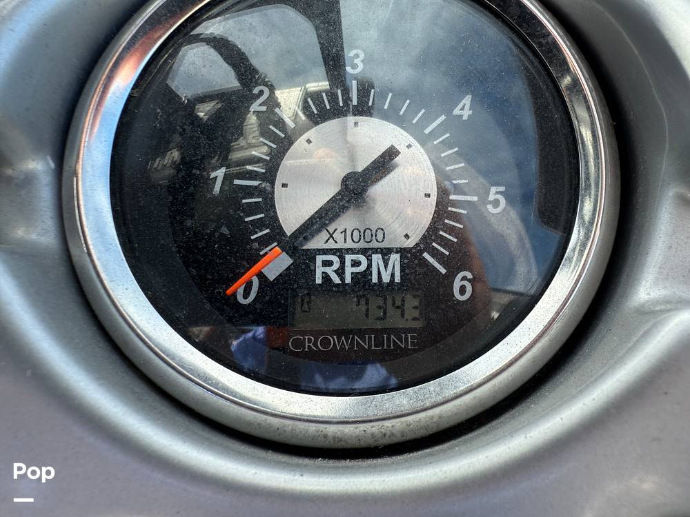 The Crownline is equipped with a Mercruiser 350 MAG inboard/outboard engine. The cockpit has bolstered bucket seats (captain and companion) and U Shape seating in the rear.
